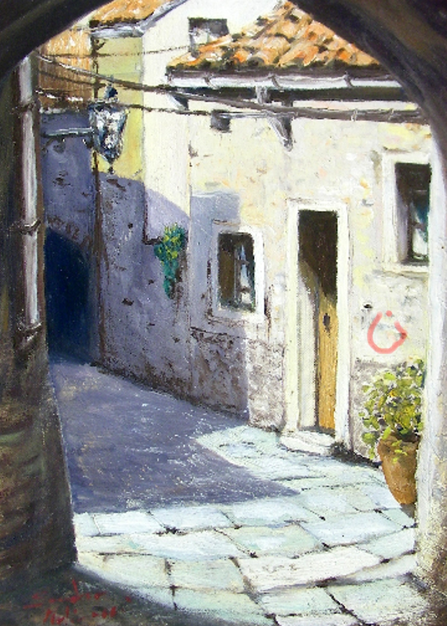 bellissima! Un opera davvero molto bella. le ombre e le luci sono oltre che suggestive estremamente realistiche, l'impasto materico dei colori dona quel tocco di antico e vissuto che ben si sposa con l'immagine del vecchio borgo.
