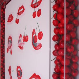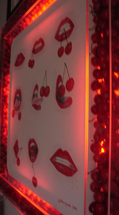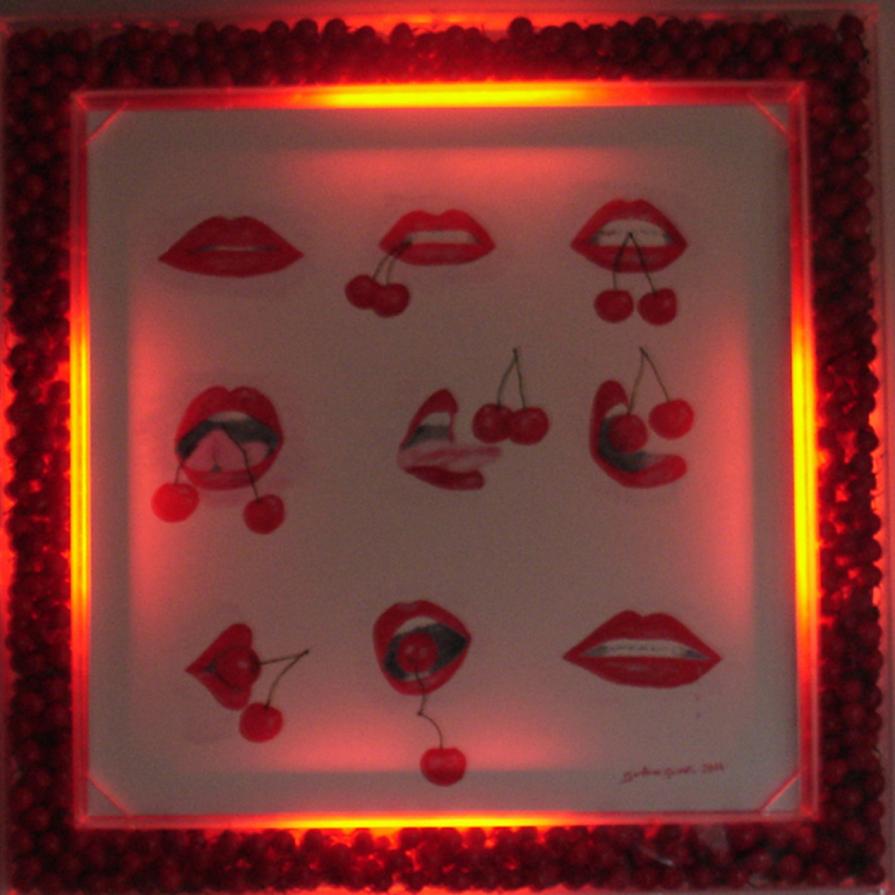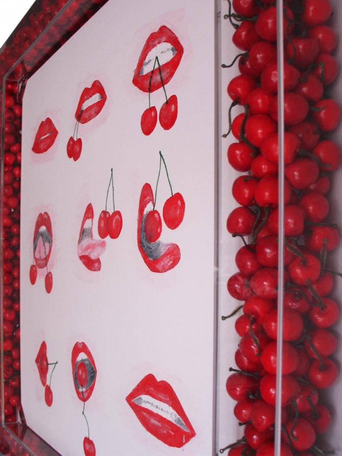 La cornice in plexiglass a significare l’evidenza, la vivacità, la voglia liberatoria di pulsioni, bramosie, aspirazioni, sogni, ecc., è riempita di ciliegie, frutto che per antonomasia si dice che una tira l’altra, a rappresentare come la vita sia un contenitore trasparente, piacevolmente visibile, nonostante i tentativi di nascondere i nostri desideri.