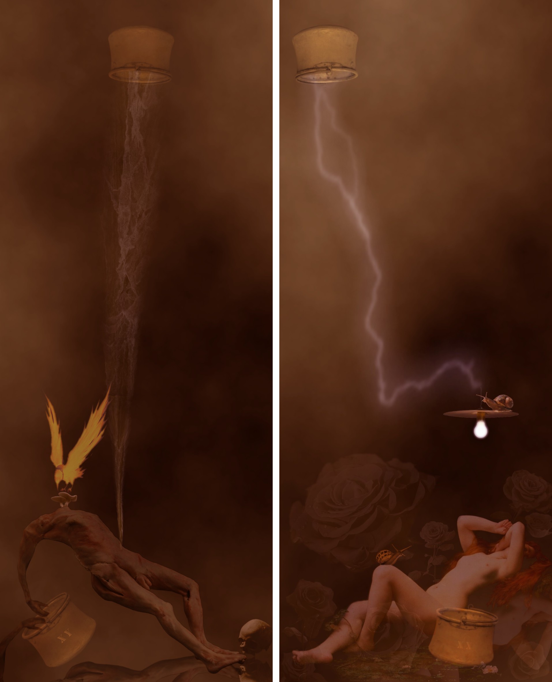 Dark Pink ha un alto grado di iconicità, ovvero, le immagini che veicola sono fedeli ai loro modelli reali; quindi, sono immagini riconoscibili. Tuttavia, il loro significato non è limitato a ciò che rappresentano; la posizione che occupano nello spazio del quadro, nonché, la loro relazione, fa si che si costituiscano come allegorie visive; le quali, infine, determinano il significato dell’opera. I due quadri che compongono il dittico, pur avendo lo stesso impianto iconografico, differiscono per alcuni elementi iconologici. Nel quadro di sinistra vi è rappresentato il declino dell’universo maschile; il corpo martoriato, acefalo (Romeu, scultura di Berlinde De Bruyckere del 2010) simboleggia la morte del maschile; il fumo che fuoriesce dall’ombelico è l’allegoria dello spirito che esce dal corpo, ormai divenuto pezzo di carne putrefatta, per essere catturato in alto da una pentola: allegoria della vita metafisica. Sotto il braccio destro, invece – che si riflette, come a volersi autoclonare –, un’altra pentola riporta le lettere XY, cromosoma maschile: allegoria della vita biologica. I funghi cresciuti in prossimità della testa attirano un uccello di fuoco che si lancia in picchiata sugli stessi per disintegrarli: è il meschino tentativo da parte dell’uomo di voler tornare a vivere per commettere le sue malefatte, ma, impedito da una volontà metafisica a cui non può opporsi. Ai piedi del corpo maschile, infine, si adagia un cranio umano, archetipo di morte. Nel quadro di destra, invece, vi è rappresentata l’evoluzione dell’universo femminile; il corpo morbido, vellutato (Maddalena nella grotta, dipinto di Jules Joseph Lefebvre del 1876) simboleggia la rinascita del femminile; la lumaca adagiata sul ginocchio – così come la donna adagiata sul letto di rose – è l’allegoria di una nuova Primavera dello spirito femminile. Spirito che viene illuminato dalla luce di una lampadina – sulla quale vi è un’altra lumaca – alimentata, a sua volta, dall’energia che fuoriesce dalla vita metafisica. Infine, in basso a destra, la pentola che riporta le lettere XX sta aspettando di essere riempita di una nuova vita.