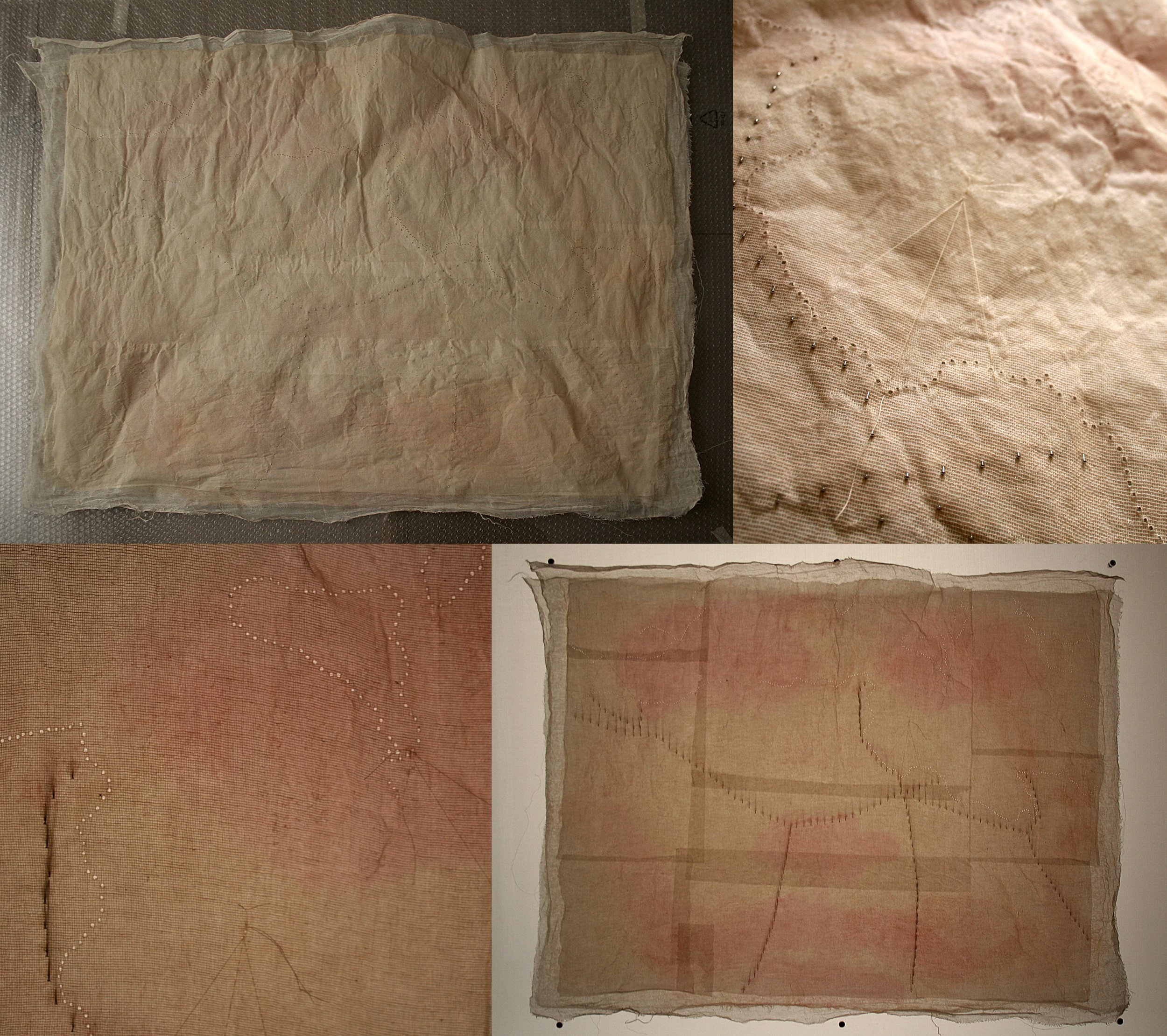 Osservando da lontano, prendendone semplicemente atto, tracciando su questa particolare cartina del nord africa e del sud europa che dà la sensazione della pelle che si sfoglia, i percorsi che portano al vecchio continente con spilli che scompaiono nel tessuto penetrandolo, piccoli ma che possono ferire. Collegando le rotte marine con fili sottili, fragili come le vite che vi sono appese. Con molteplici strati sovrapposti di garza e di carta quanti sono gli aspetti di una storia, con l’ombra di un volto appena percettibile e immenso come alle volte può essere una vita.