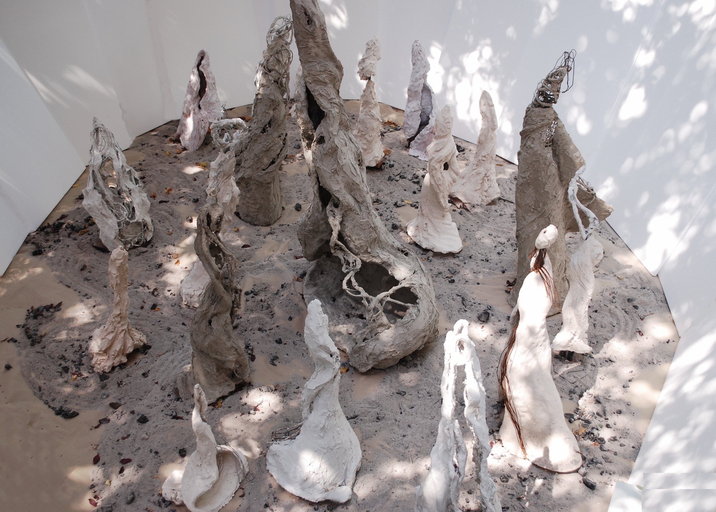 La folata giunge calma e, attraverso la cenere, pare tessere un filo che volatilizza fra le figure, poi gradualmente sembra aumentare il ritmo: quasi un turbine tra gli antri.