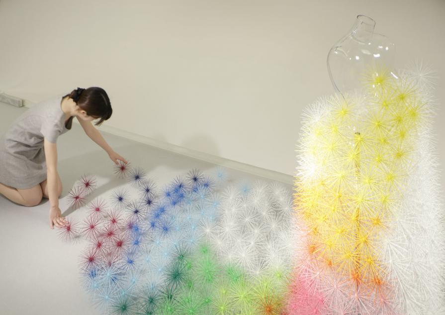 Toge (Japanese for thorn) is a modular product. Each "thorn" gives the viewer the impression of a sharp and stiff object, but these modules can in fact be freely combined to create a soft, pliable and standalone space. At DESIGNTIDE TOKYO 2011, Emmanuelle arranged five hundred of these Toge modules in 15 different colors to form a wedding dress. This conceptual piece was an exercise in contradictory impressions and sensations - solid and stiff but soft and pliable, menacing yet gentle.
