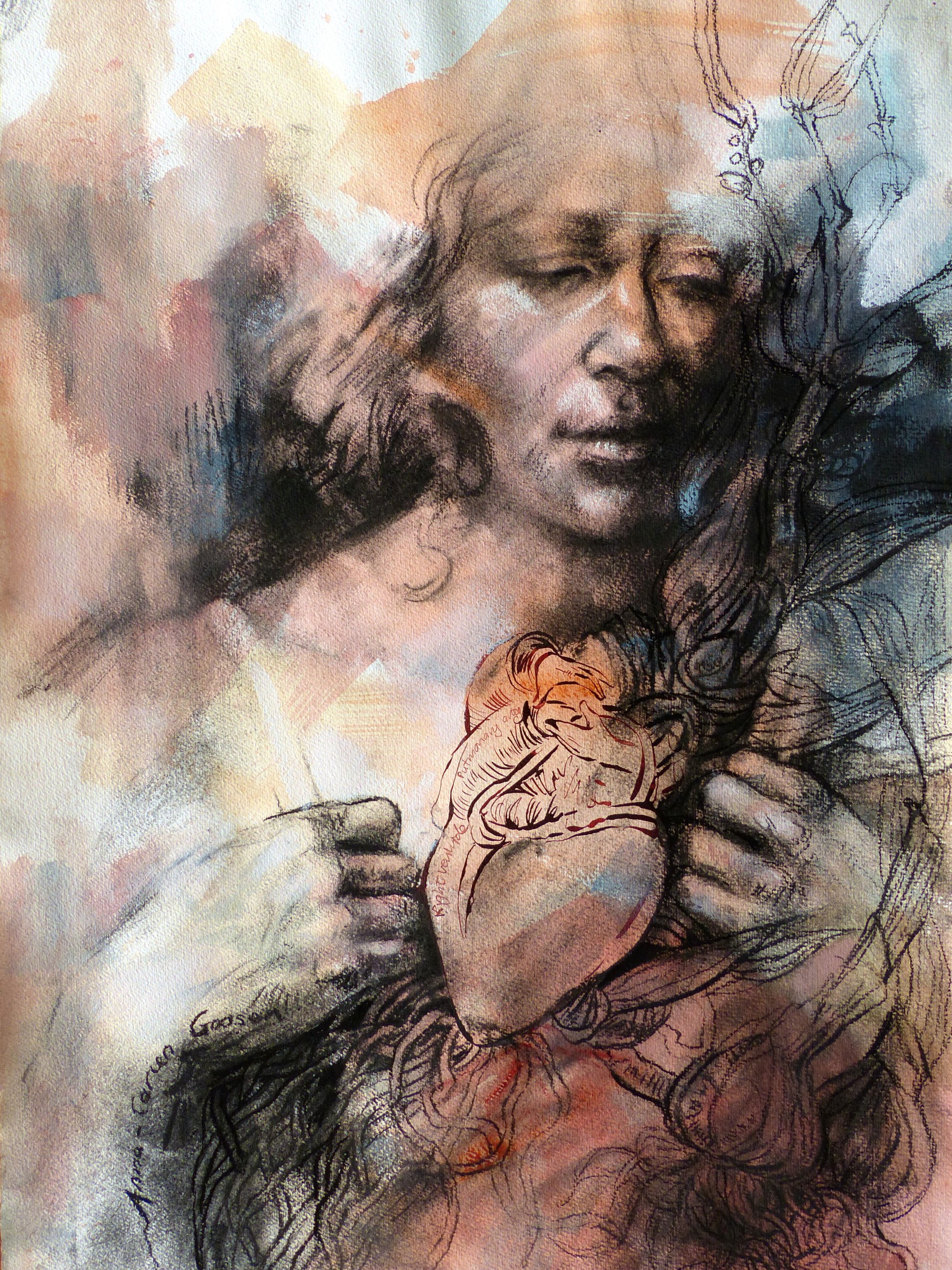 These works are about the potential for growth in the “in-between” places. By mixing charcoal, ink, water, paint and oils, boundaries are blurred and new solutions are possible. The liminal space is filled with ambiguities and contradictions, disruption and disorientation. I believe discomfort can be endured if there is hope for growth. Images of botanical and anatomical growth are overlapped to signify these liminal states.