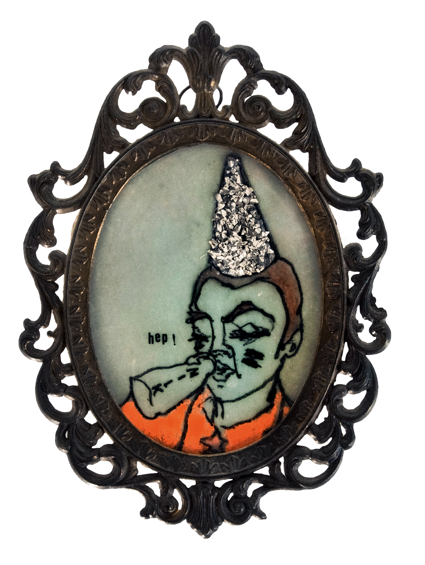 Ho giocato sul contrasto tra l'uso pop del colore, il soggetto così come è ritratto e la cornice, cimelio di altri tempi, che conferisce al lavoro una nota preziosa.