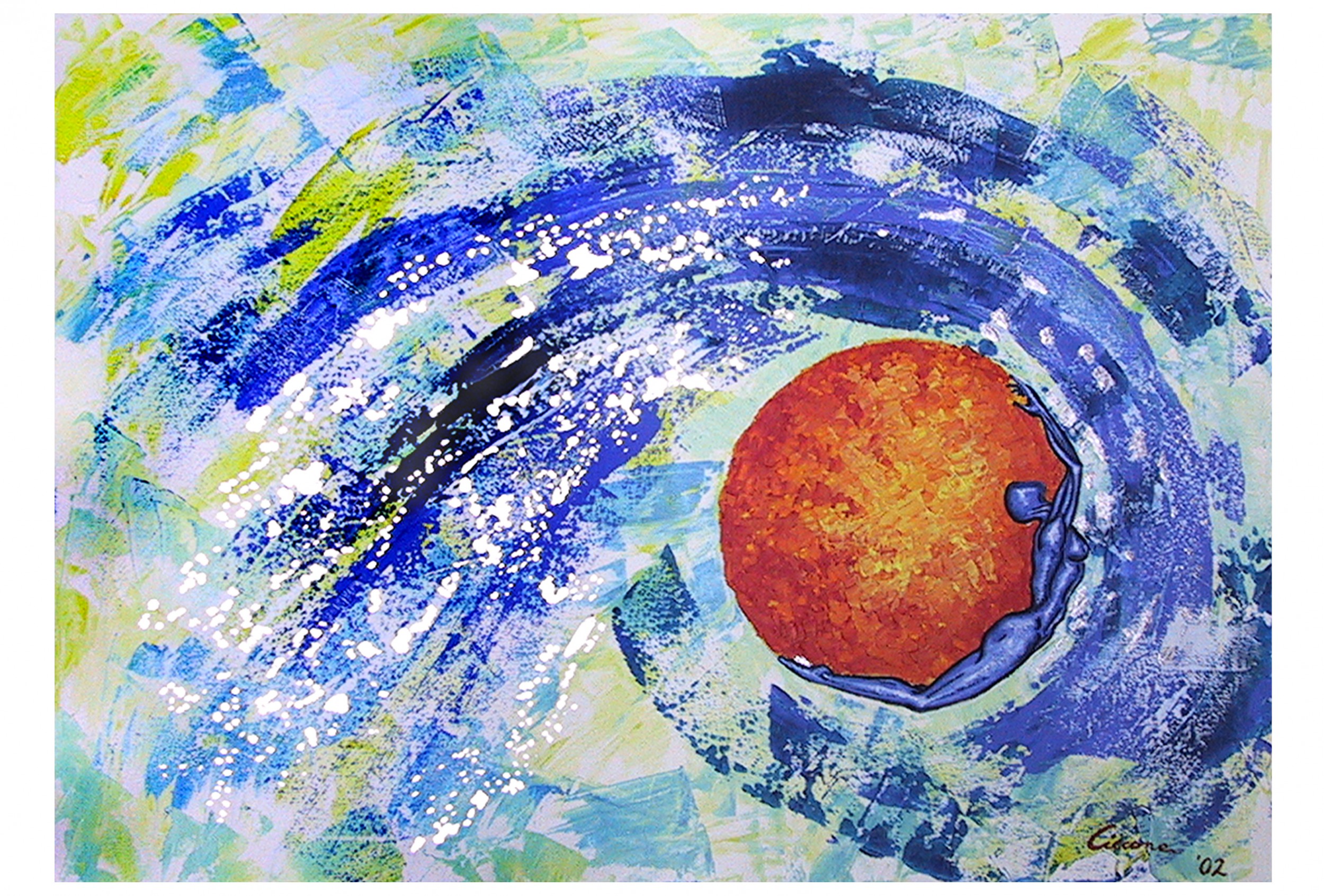 "Rocheville", 2002, acrilico e foglia di metallo su tela. La figura umana granitica, scarnificata, privata dei lineamenti del volto, concentrata nella sua materia rocciosa, avvolta in un’atmosfera luminosa.