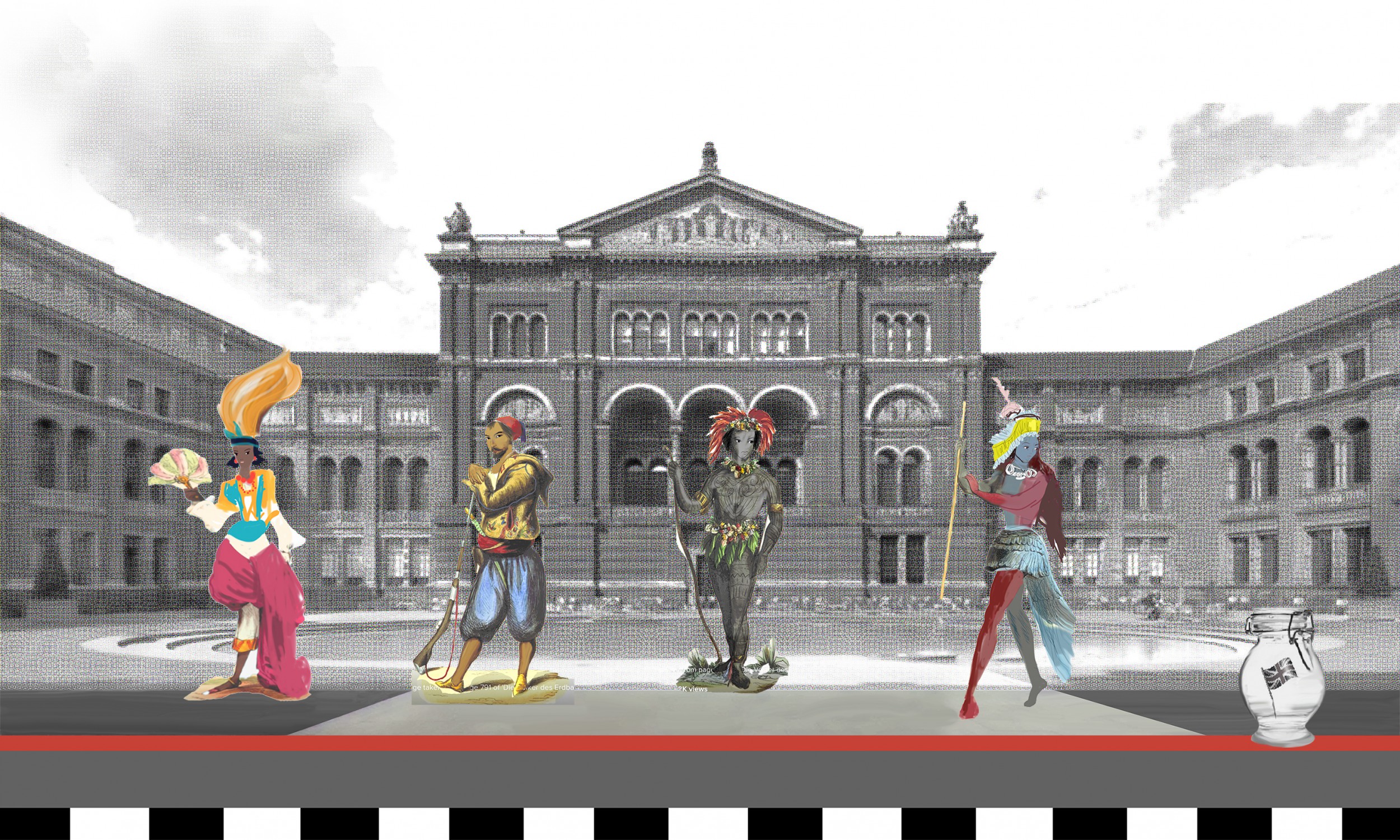 This is part of an ongoing series, where i am using museum’s facades and photos from museum’s archives, to build fictional realities and talk about issues pertaining to current events. The technique is varied, mainly envolving mixed media over printed digitally manipulated photos. The series is an homage to museums, these unique very dynamic yet meditational places where new connections between seemingly unrelated objets or events are established and where past and present are being woven together to come up with new narratives, questioning the past and imagining the future.