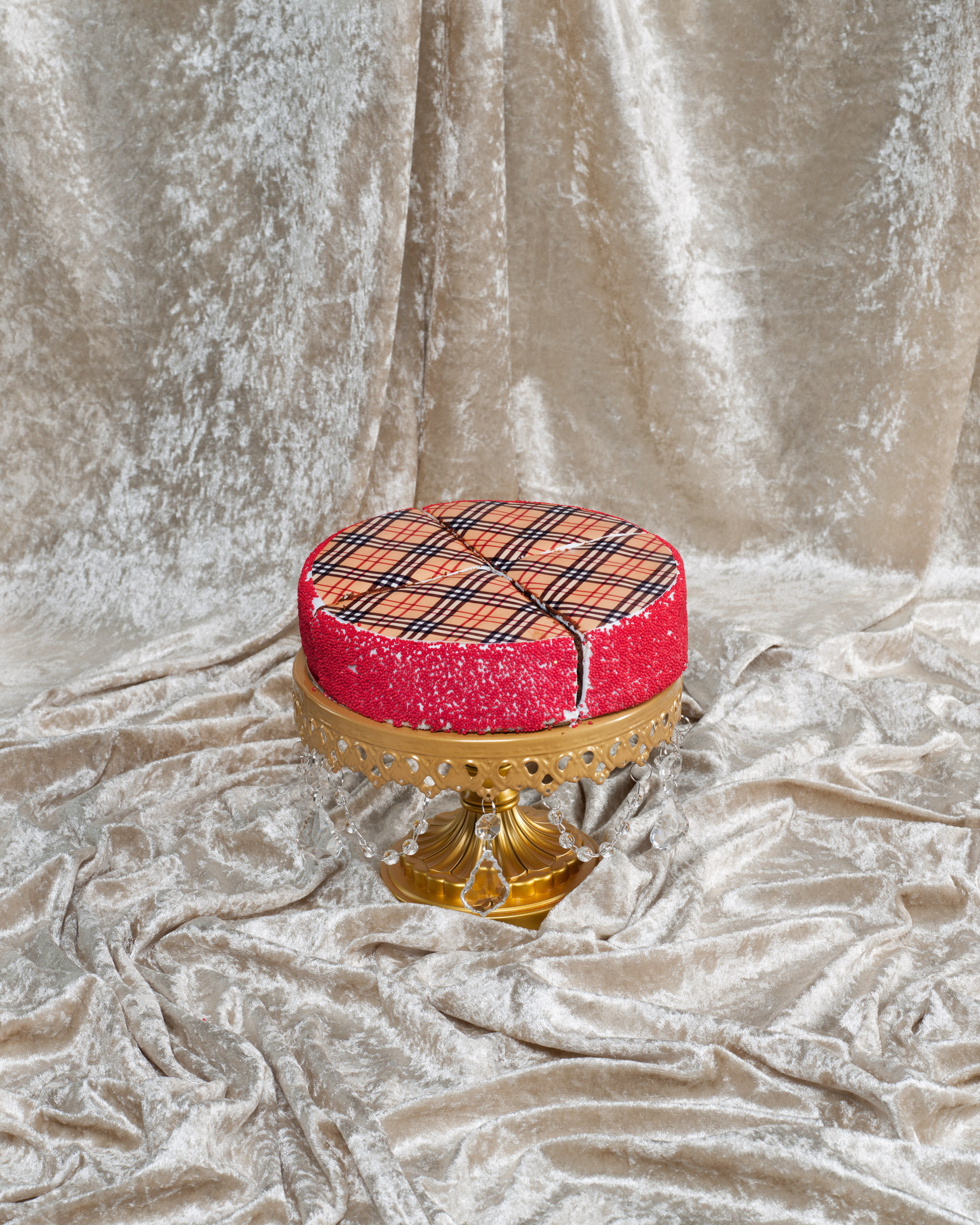 The photograph "Piece of Cake" is part of the body of work "Tales of Lipstick and Virtue" and symbolizes figuratively the textil and brand industry and the commodity fetish of the contemporary society we live in. These industries are a complex mesh of various requirements, from the people living in poverty working at the lower end of the hierarchy trying to make ends meet, to the network of imitations and the global players. Built up on a blurred thin line between legality and illegality, pseudo luxury and luxury, bootleg and original.