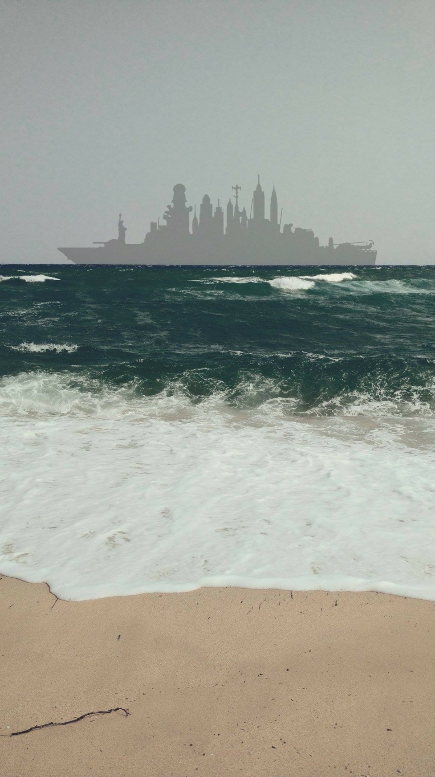 In un periodo storico vessato dall'incertezza e dai conflitti politici e sociali, chiunque di noi si sente alla "deriva". In un laconico paesaggio marino si staglia lontana la silhouette di un'indefinita nave da guerra, alla quale si sovrappone lo skyline della città di New York, simbolo di quegli Stati Uniti che, oggi più che mai, rappresentano l'immagine del malessere globale.