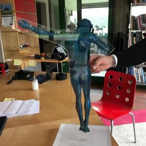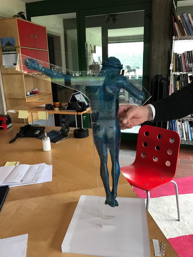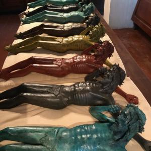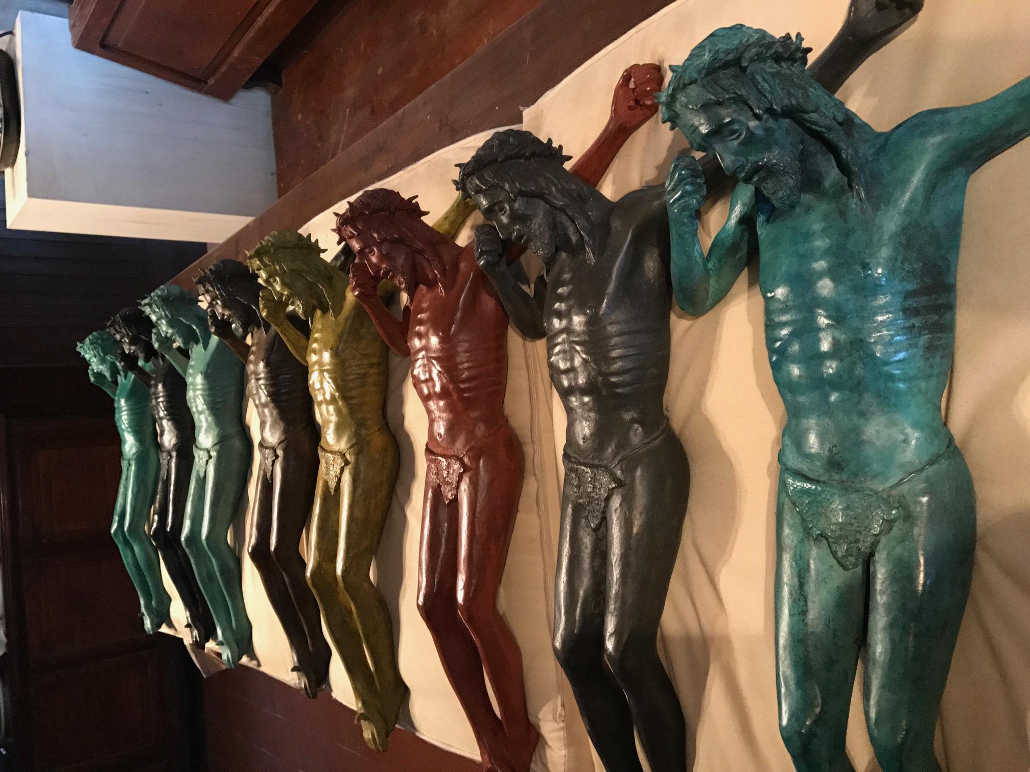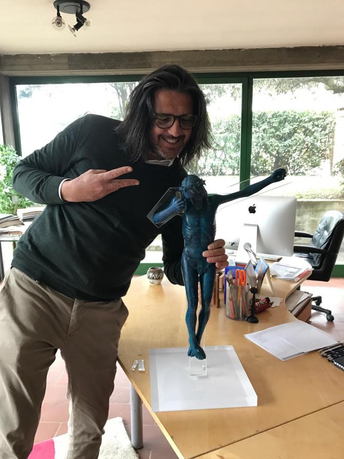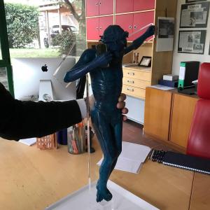 altezza 60 larghezza 46 peso 8,5 kg Quest'opera nasce dopo 4 mesi di duro lavoro . è realizzata in bronzo tramite fusione a cera persa e colorata di blu, evidenziando in bronzo lucido solo alcuni particolari, come parte della barba alcuni tratti dei capelli, i chiodi della corona e delle mani, in maniera che renda mossa la scultura. ognuno dei 9 pezzi ha un colore diverso e ciò li rende unici. quest'opera è la P.A. di n°9 , senza paura di smentita questa serie è unica al mondo, vuole rappresentare due dei simboli più riconoscibili della nostra era nonostante abbiano 2000 anni di differenza, Cristo in croce ed uno smartphone. Ho appositamente fatto il viso del Cristo poco sofferente, cercando di dare all'osservatore l'impressione dell'attesa di una risposta. Risulta facile per chi lo visioni capire chi possa essere l'interlocutore assente, ma per i più profani ho volutamente inciso sullo smartphone DAD.