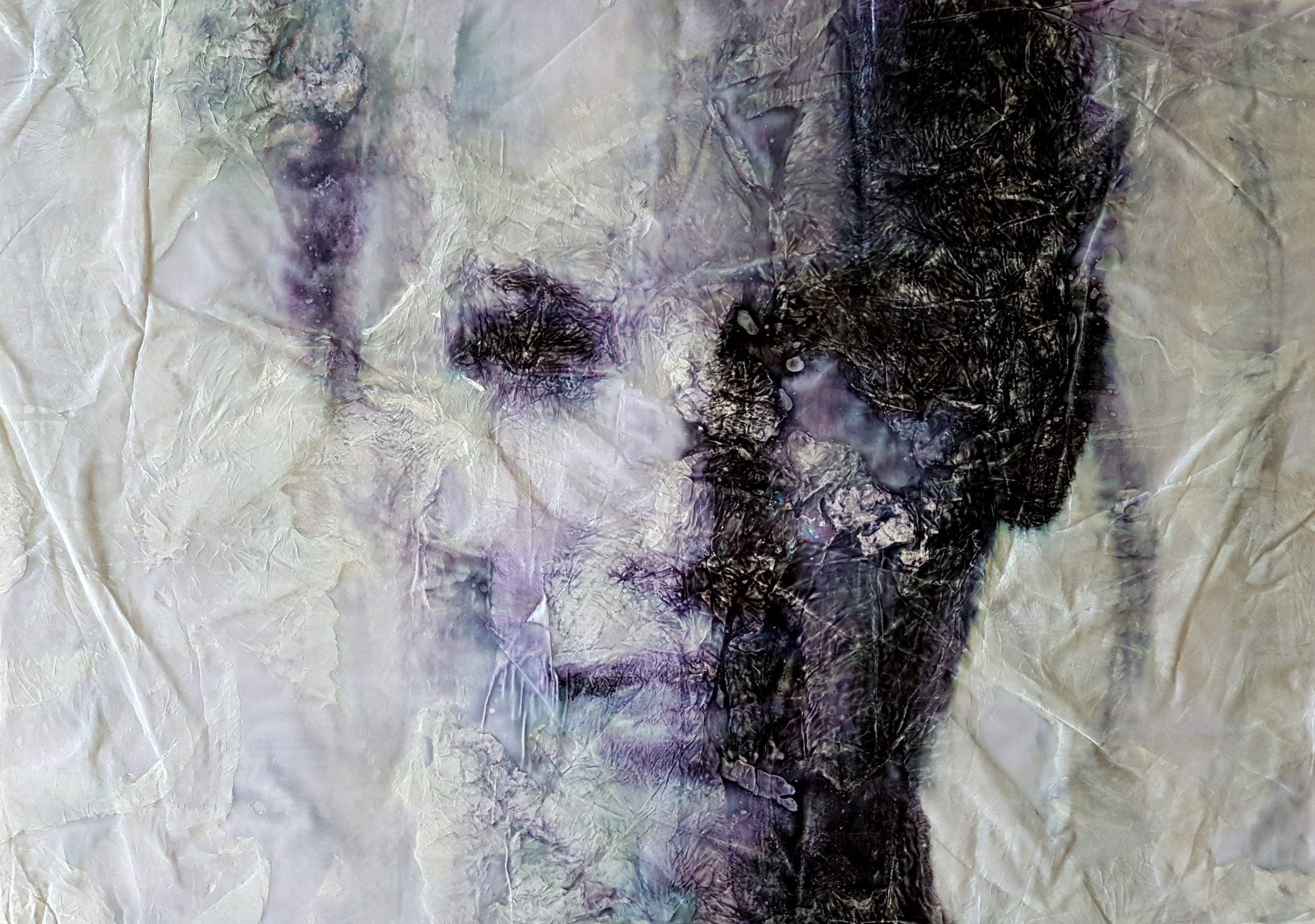 I start with a wrinkled canvas (prepared before) and then I paint with differents materials (acrylics, inks, watercolours, felt-tips, resin).