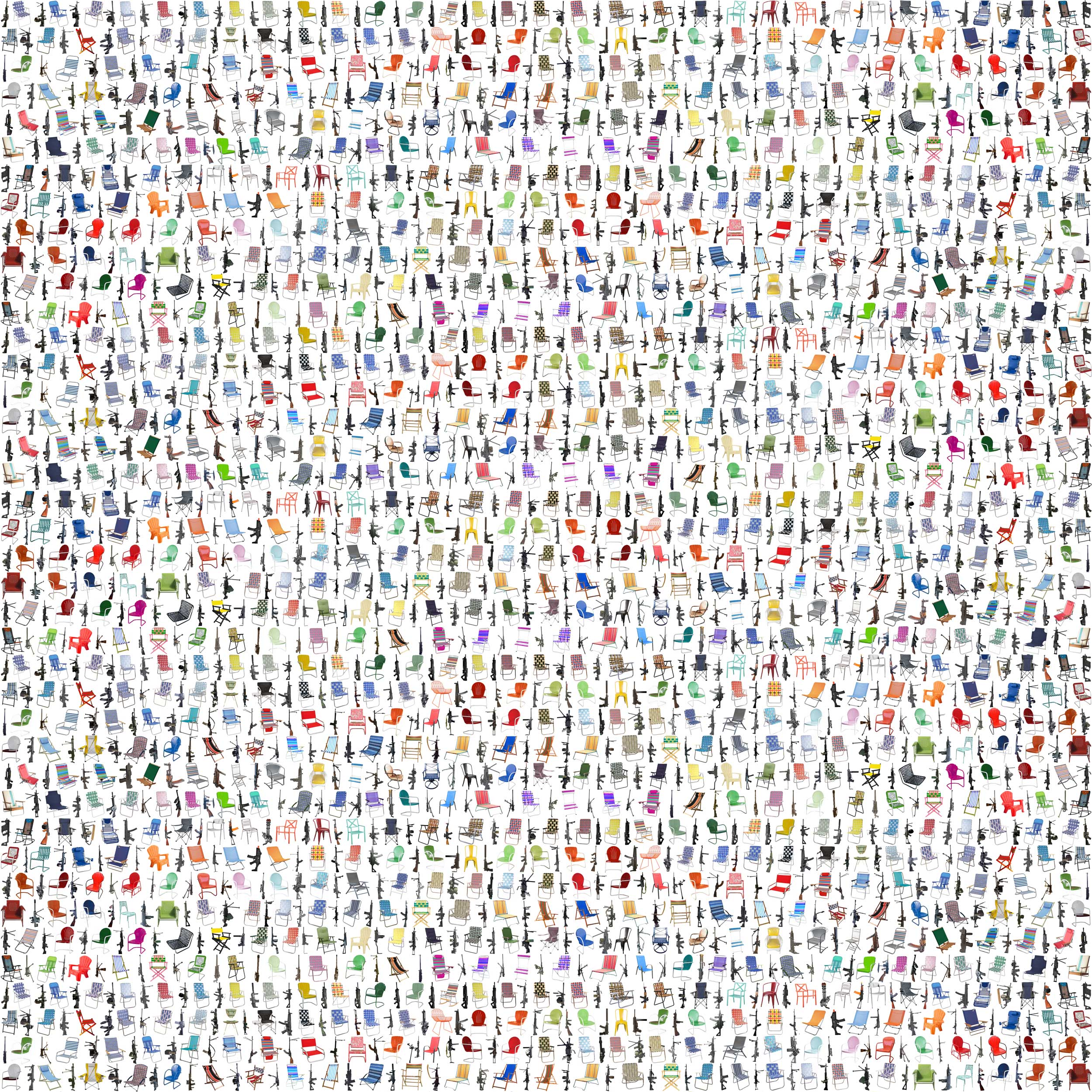 The work takes form from hundreds of appropriated images from Internet searches that visually amplify the information to be processed by the viewer. Reminiscent of binary code and ancient cuneiform writing, these alternating patterns reinforce its intent to be observed as a language. At the same time, they confer to it, in aesthetic terms, a frequency of digital noise, that evokes a state of apophenia, the human tendency to perceive meaningful patterns within random data.
