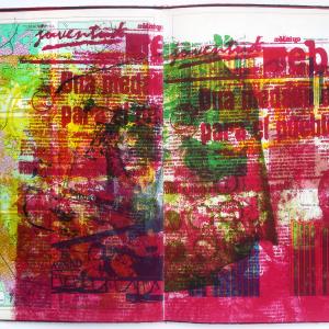 ?ESTA ROJO? is a collaged printing of found historical images and current images from newspapers in the spring of 2006 onto 1980's Cuban geography text.