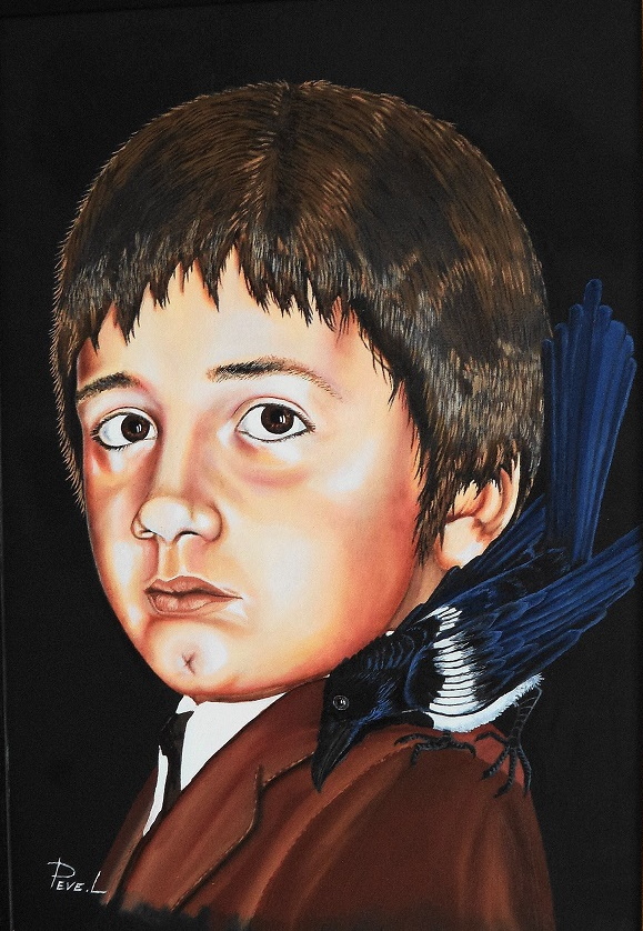 Ho voluto ritrarmi oggi alla età di 11 anni ,per non dimenticare chi ero e chi sono,la gazza ladra era di mio padre presa da un nido caduto da un albero ,era un pulcino con ancora gli occhi chiusi e fatta diventare adulta da lui ,lo seguiva in ogni dove come un bambino.La gazza ladra rappresenta mio padre la sua indole ,la sua essenza, ho voluto ricordarmelo cosi'.