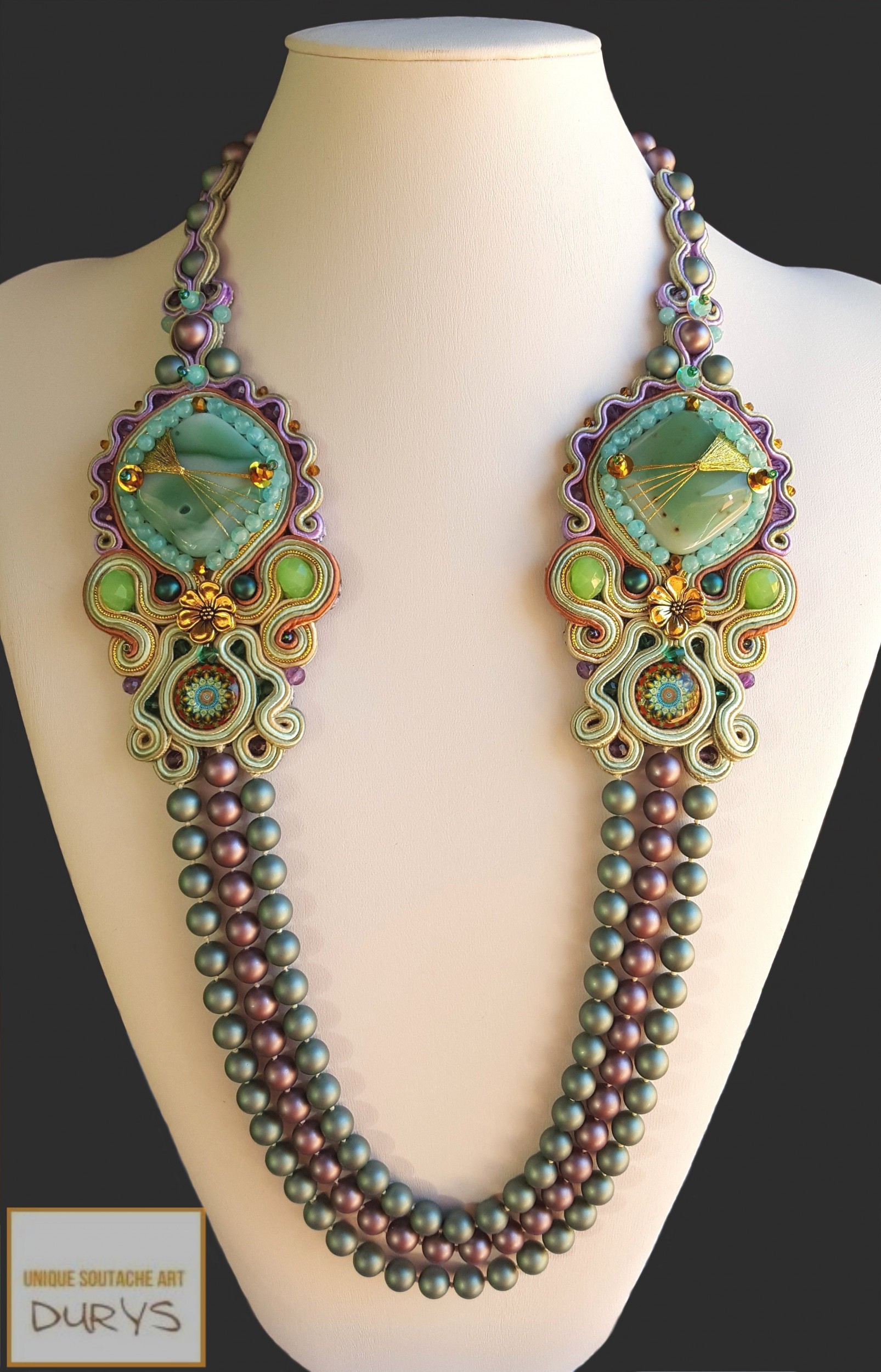 Collana ODEON con giada, perline di calcedonio,bottoni colorati , perle di conchiglia, cristalli austriaci e perline Rocailles. Chiusura T-Bar dorata.