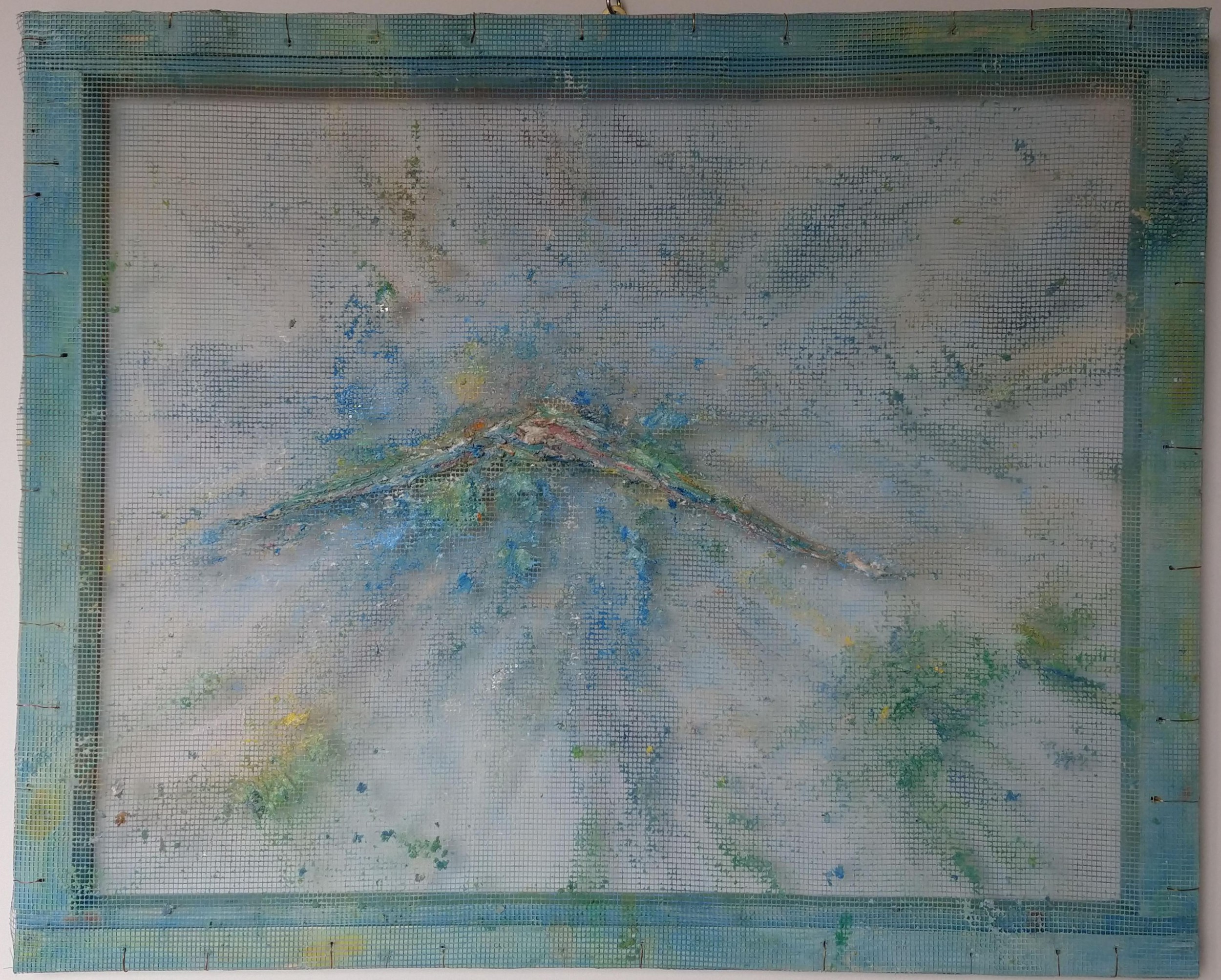 tecnica mista materica stucchi plastici smalti acrilici su rete plastificata fissata con cavi metallici in una cornice di legno di recupero