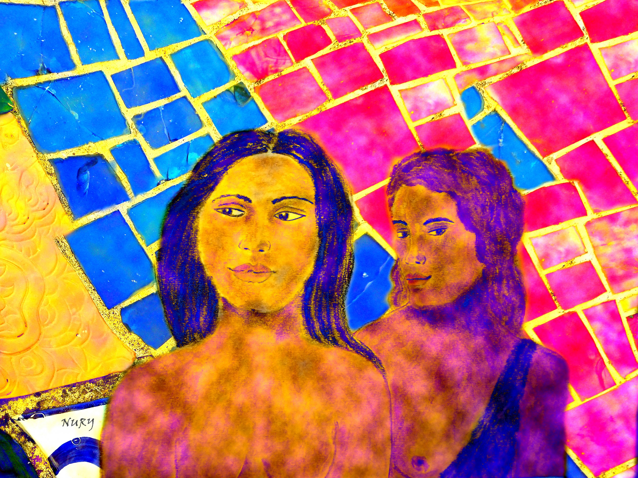 Si condividono gli sguardi vestendosi della sola pelle, mentre decorazioni cromatiche donano una luce di sfondo al mosaico della vita.