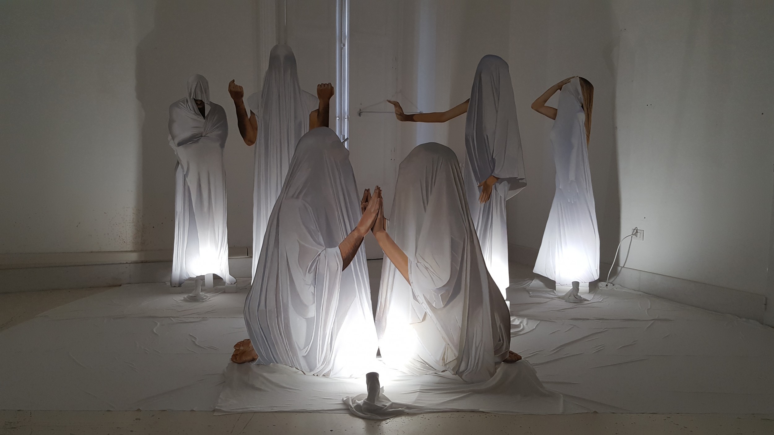 I lavori sono a grandezza naturale, il legno è spesso 8 mm e sotto ogni sagoma ha una base a forma di L, in modo da permettere una maggiore stabilità della sagoma, tranne per la prima, posta in primo piano, che, per l’immagine che rappresenta, non è stato possibile metterla e quindi, in sua sostituzione, sono stati posti dei gommini bianchi di 25 mm. Dietro ad ogni sagoma è stata installata un’asse verticale, per far si che il legno non s’imbarchi, e un’altra asta di legno parallela alla prima, collegate con una cerniera a mo’ di cavalletto, per reggere in piedi la figura. I soggetti sono stati dipinti a olio. Il lavoro, progettato per un luogo buio, viene man mano svelato attraverso l’accensione dei faretti posti sotto ad ogni sagoma. Inizialmente è stato steso sul pavimento un telo di lycra bianco elasticizzato di dimensioni 4 m x 4 m sul quale porre le sagome. A partire dal fondo della sala, le sagome sono state disposte a ventaglio: a sinistra sono presenti quelle degli uomini, a destra quelle delle donne. La quinta, invece, poiché rappresenta due persone inginocchiate una difronte all'altro che si toccano con le mani, è posta al centro in primo piano. Tutto è accompagnato da una musica di sottofondo, avvolgente e suggestiva, tale da creare un’atmosfera calma e rilassante. L’intera installazione, particolare grazie alla staticità del legno contrapposta alla leggerezza e fluidità del velo, è stata studiata per suscitare nell'osservatore l’idea di trovarsi difronte a persone senza identità; in effetti le figure esposte non hanno un nome, un’identità, ma, permettono a chi li osserva di immedesimarsi in una di esse.