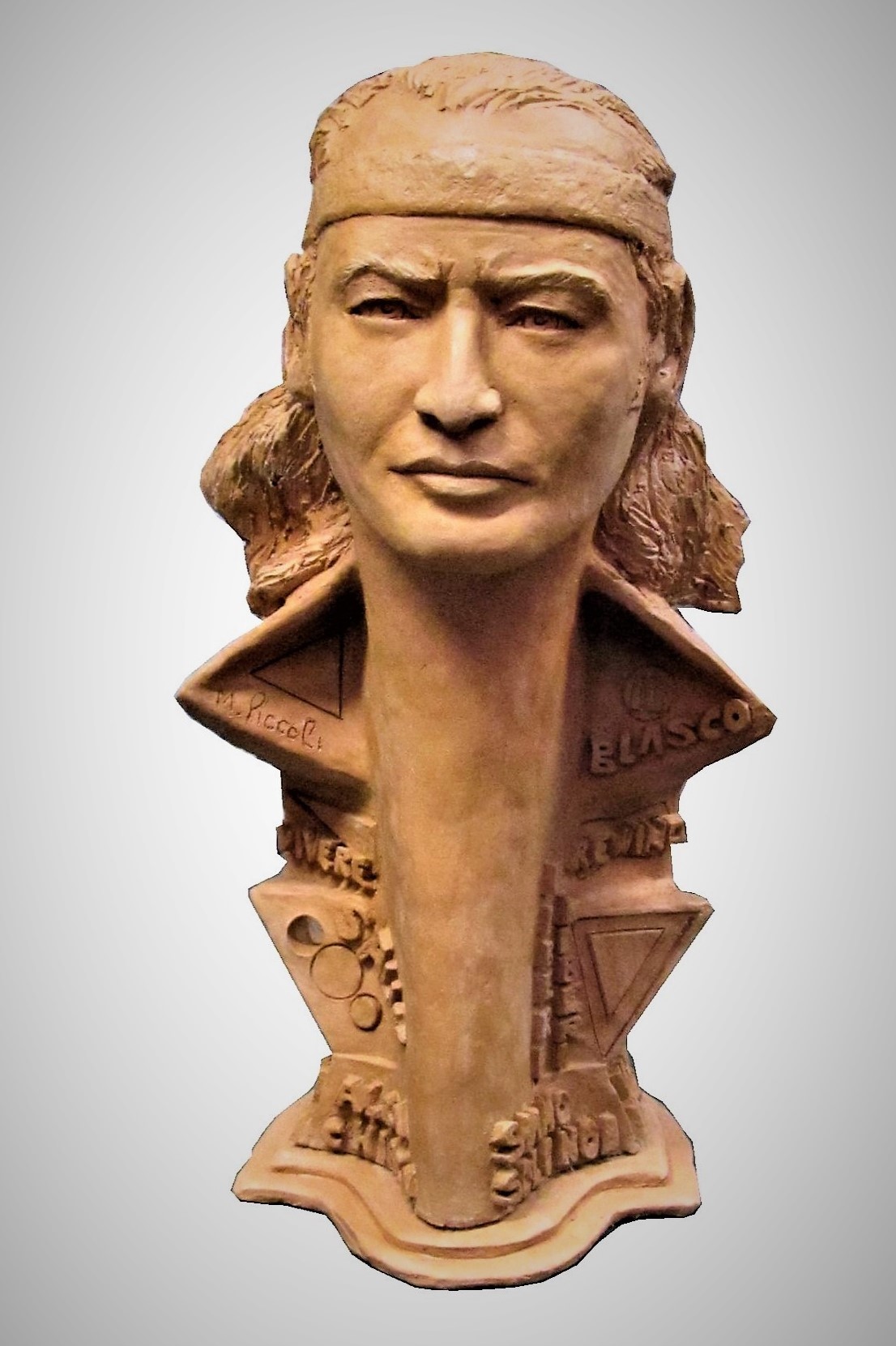 "Blasco" scultura in terracotta patinata raffigurante un concettuale Vasco Rossi, facente parte delle sculture della mostra "Vasco e i Musicisti della via Emilia", realizzata a Zocca nell'Agosto 2018, dedicate al gruppo di cantanti emiliano romagnoli che vivono lungo la via Emilia.