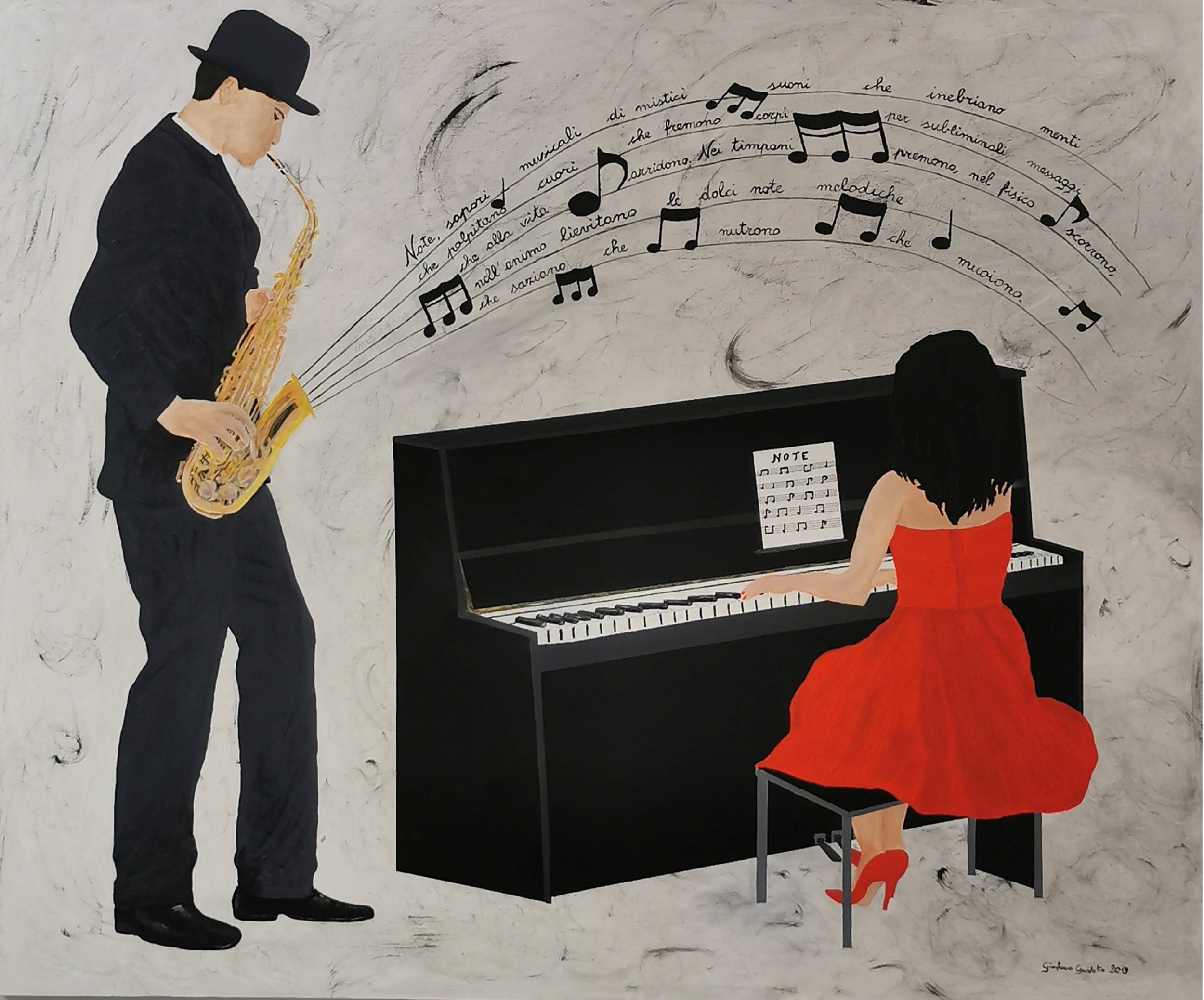 NOTE Pittura, Figura umana, Emozione, Acrilico, 120x100cm musicisti emozione atmosfera poesia visiva L’opera è la trasposizione visiva di una poesia dello stesso autore. Inserita 6 anni fa 2 Mi piace Non piace più 0 Commenti 264 Visite Condividi Facebook Twitter Google + Piace a 2 Felice Voto Artista - Salerno Tanya Bartolini Premium Artista - Milano Commenti 0 Inserisci commento E' necessario effettuare il login o iscriversi per inserire il commento Login