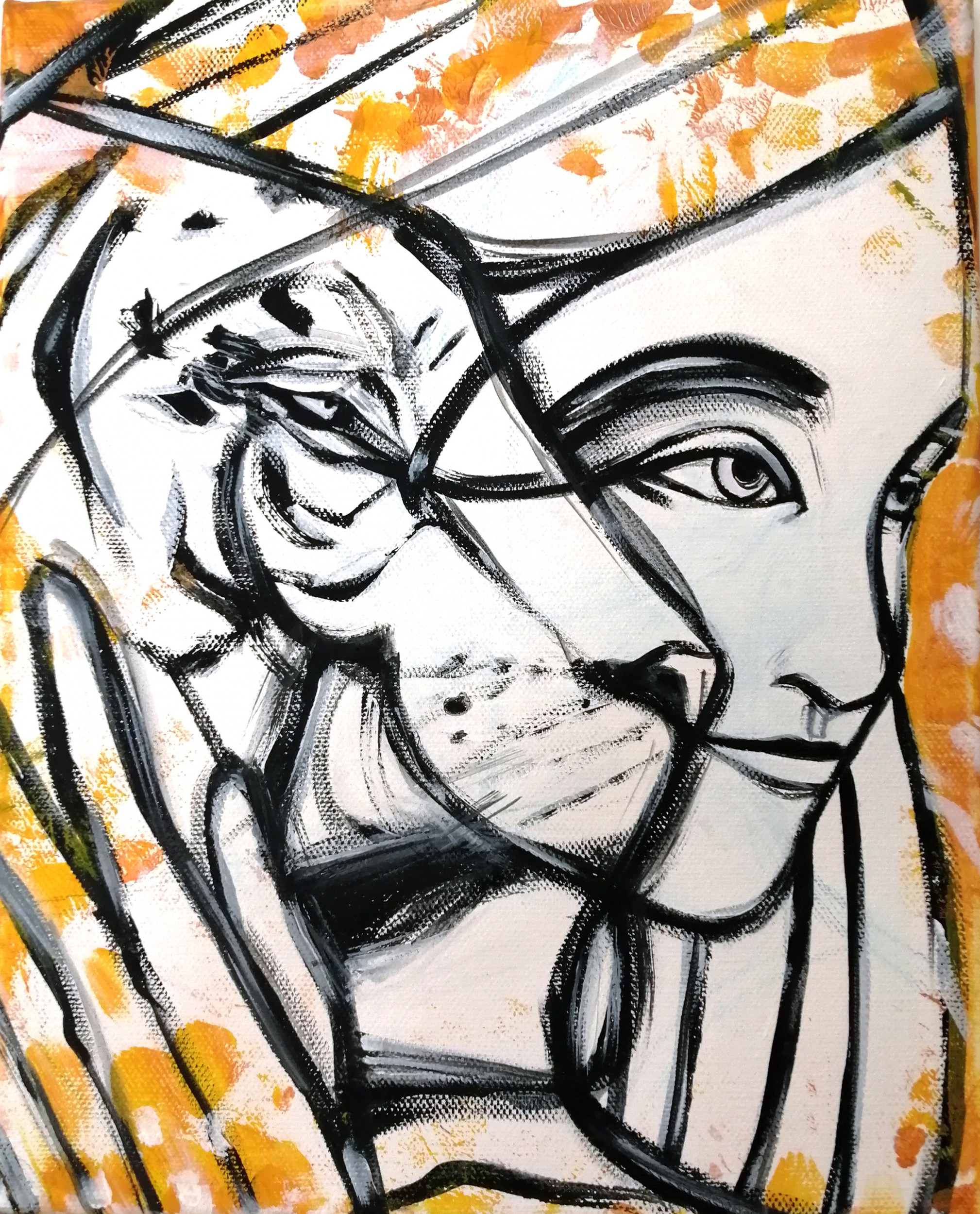 Sketch veloci e sfrangiati su tela, colori acrilici a secco. Pensavo ad un'anima dal volto felino, simile a una tigre, che è lo "spirito guida" che preferisco.
