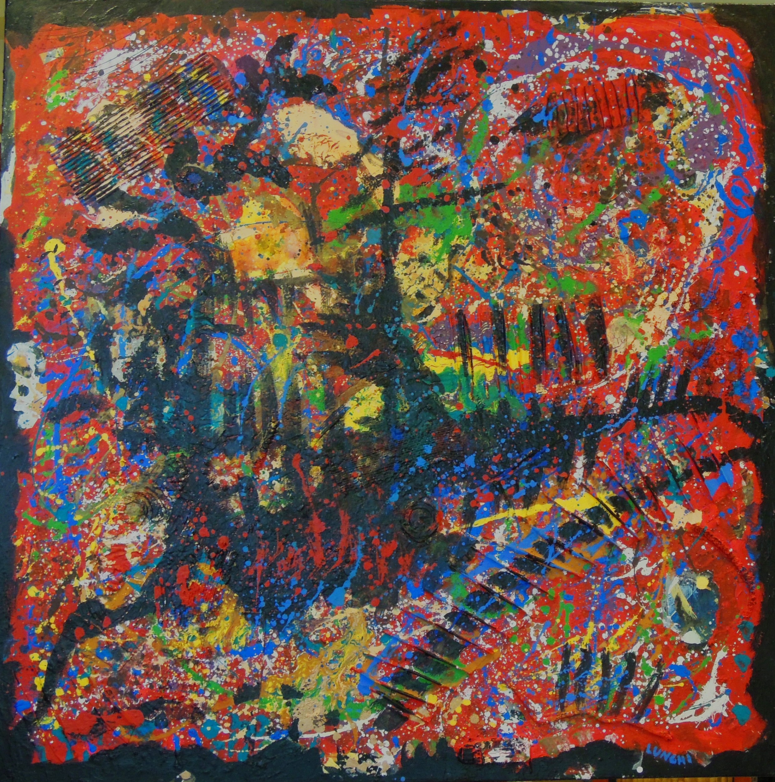 I grumi sono quelli che si formano quando il silenzio sostituisce le parole che non vengono pronunciate, parole senza suono, anche se pensate, rimangono inespresse e si aggrumano tra loro. Si riporta sulla tela non solo il già visto, ma la conoscenza antica costituita da sensazioni, memorie, ricordi e sapienza di umanità che costituisce il nostro patrimonio genetico e culturale. È importante far emergere liberamente tutto questo per esprimere ciò che è segreto e nascosto anche a noi stessi, per poter dare una lettura consapevole della nostra attuale condizione di vita Si attinge alla spinta interiore e all’inaudita forza del colore, della forma e della materia per abbattere vecchie strutture e luoghi comuni che impediscono di esistere e di vedere e si procede oltre. In questo processo la ragione non ha spazio, l’unica chiave è il libero scorrere. La pittura liquida scivola e scorre sulla tela creando un insieme di forme e colori che evocano sia astrattismo sia figurativismo, si mescola e s’impasta alla materia volta a volta diversa. Rifiuti urbani: latta, carta, sabbia, tessuti e ….