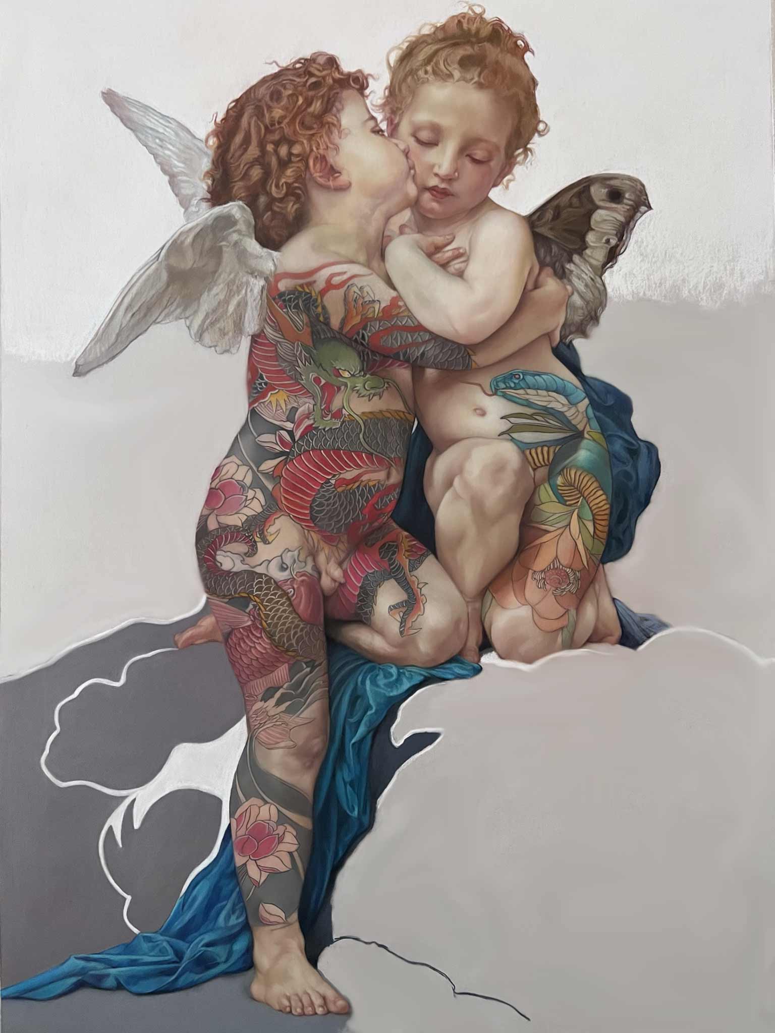 Omaggio a Bouguereau. Disegno realizzato con pastelli secchi su carta pastellmat. L'opera originale erroneamente denominata "Firts Kiss" è stata riprodotta. Il fondale appiattito e le figure riportano dei tatuaggi, disegnati dall'autore, sottolineano in chiave taoista la lotta tra yin e yang. Ossia drago e serpente che lottano e ritrovano equilibrio nel bacio, l'amore tutto ciò che fanno da cornice ad esso.