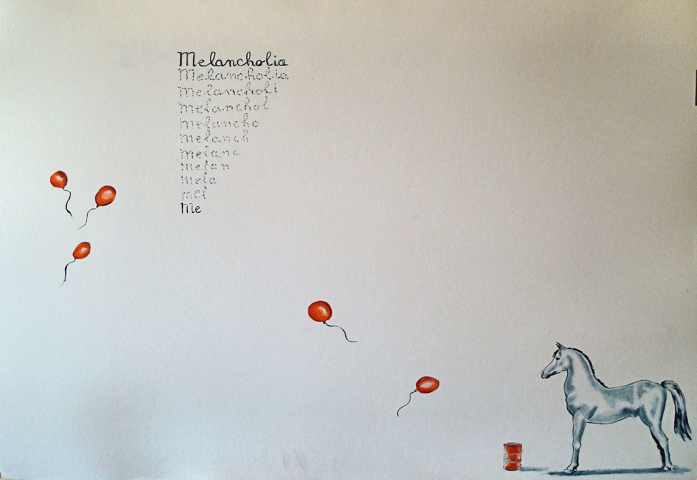 Me-Melancholia: un gioco di parole - un gioco con i palloni rossi - un gioco da bambino - un gioco per adulti? No, per CAVALLI. Si, è la me-melancholia. Tristezza che scaturisce dal se, che va da ME-medesimo alla ME-lancholia, che irrigidisce il cavallo, che NON SI MUOVE PIU'...