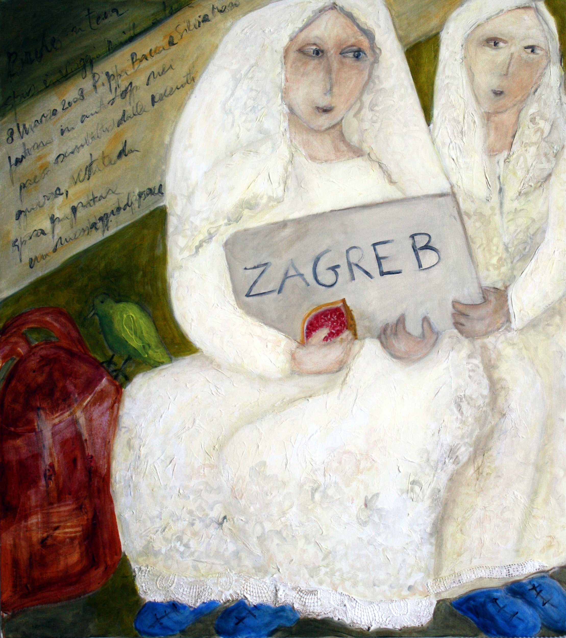 Omaggio all'artista Pippa Bacca e al suo viaggio-performance finito tragicamente con la sua morte in Turchia. Era partita da Milano vestita da sposa insieme a Silvia Moro per portare nei paesi del Mediterraneo sconvolti dalle recenti guerre un messaggio di pace. Proprio come inno alla vita Pippa Bacca ha realizzato durante il viaggio la "Lavanda dei piedi" alle ostetriche del posto, come simbolo di riconoscenza e gratitudine verso queste donne che permettono alla vita di nascere in luoghi in cui la guerra troppo spesso non ne ha rispetto. Silvia Moro ha invece utilizzato l’antichissima arte del ricamo che ha varcato i confini territoriali e culturali ancora prima di quelli linguistici, chiedendo alle donne che ha incontrato in ogni paese di realizzare ricami sul suo abito che contaminandone il bianco, rivelano e testimoniano la rete di connessione e relazioni possibili come dissolvimento dei limiti territoriali, culturali e linguistici, in nome della pace.