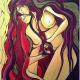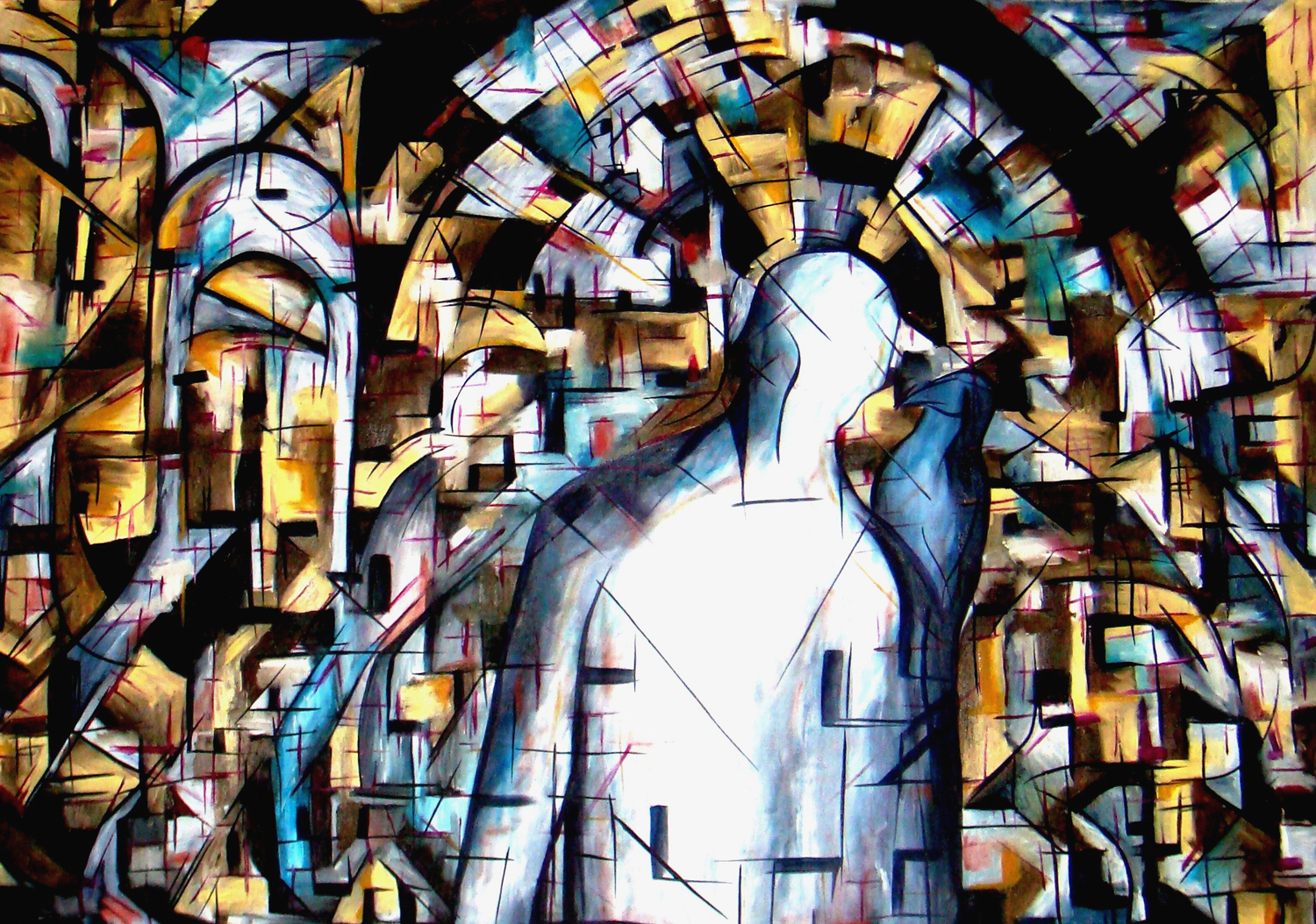 "Through the Looking Glass" is the portrait of a man peering through the window to his soul. The geometric style, with its sharpness of lines and shape, trigger the logical and masculine aspects of the self in the bold search for answers and truth. The truth however, as this painting suggests, does not lie merely in what he might see ahead or through the many windows of the future. So as he gazes out, he also attempts to catch a glimpse of his own reflection from the glass of the window, to better understand the past and the indeed the present. The many geometric shapes shown in this piece represent the multiple shifting facets of the self in his search for truth; and as the dark crow sits firmly on the man's shoulder, the man is all too aware that truth has the vivacious power to trigger change. As the man peers through the looking glass, he also tempts the audience to do the same: What truth can you see that will tempt change to come your way?