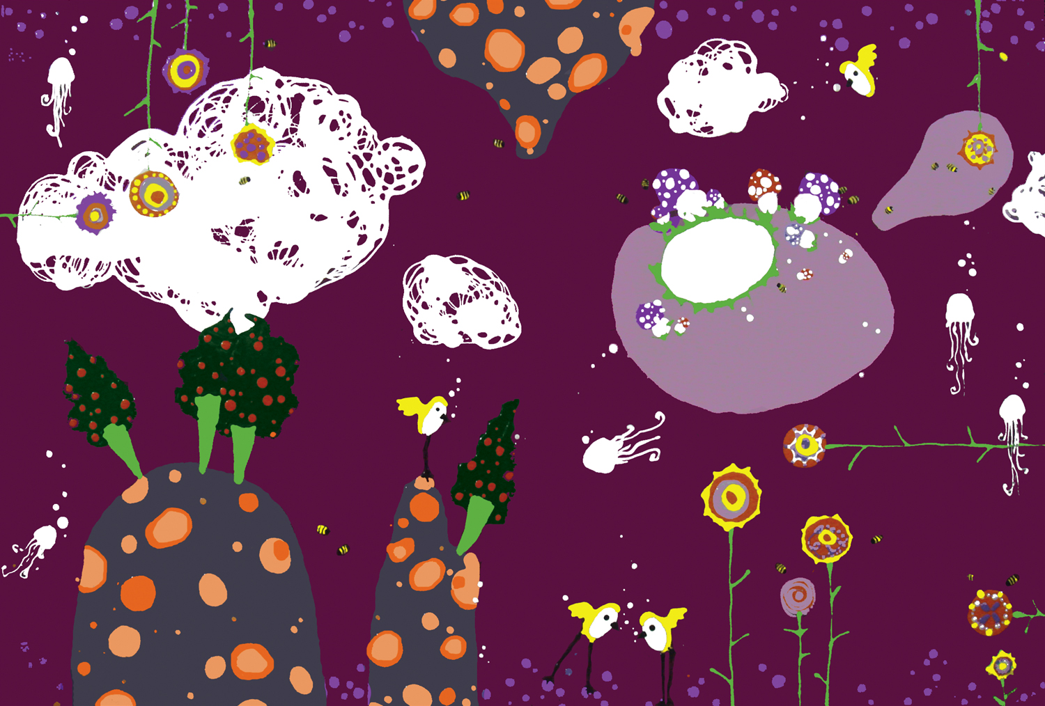Ed ecco nuvole di filo che si raggomitolano insieme per fare un po' d'ombra agli alberi-gelato variegati all'amarena, le api senza ali raccolgono il nettare dagli strambifiori, le meduse fantasma risalgono in cerca di ossigeno verso un cielo terso di un viola ormai perso, le montagne morbillose accolgono le tane-nido dei passerotti coscialunga ed il lago di latte ghiacciato ormai dai funghi a pois è circondato. É un mondo che sopravvive anche se! Chiuso nel suo fragile equilibrio, un caos fantastico in cui cielo-mare e terra si fondono e confondono in un unico, stupefacente ed improbabile cosmo, abitato da creature strambe ed affascinanti, altre misteriose e fatali. Vite in bilico tra sogno e realtà, personaggi di una fiaba contemporanea di un Mondo che ... aspetta e spera... in Apnea.