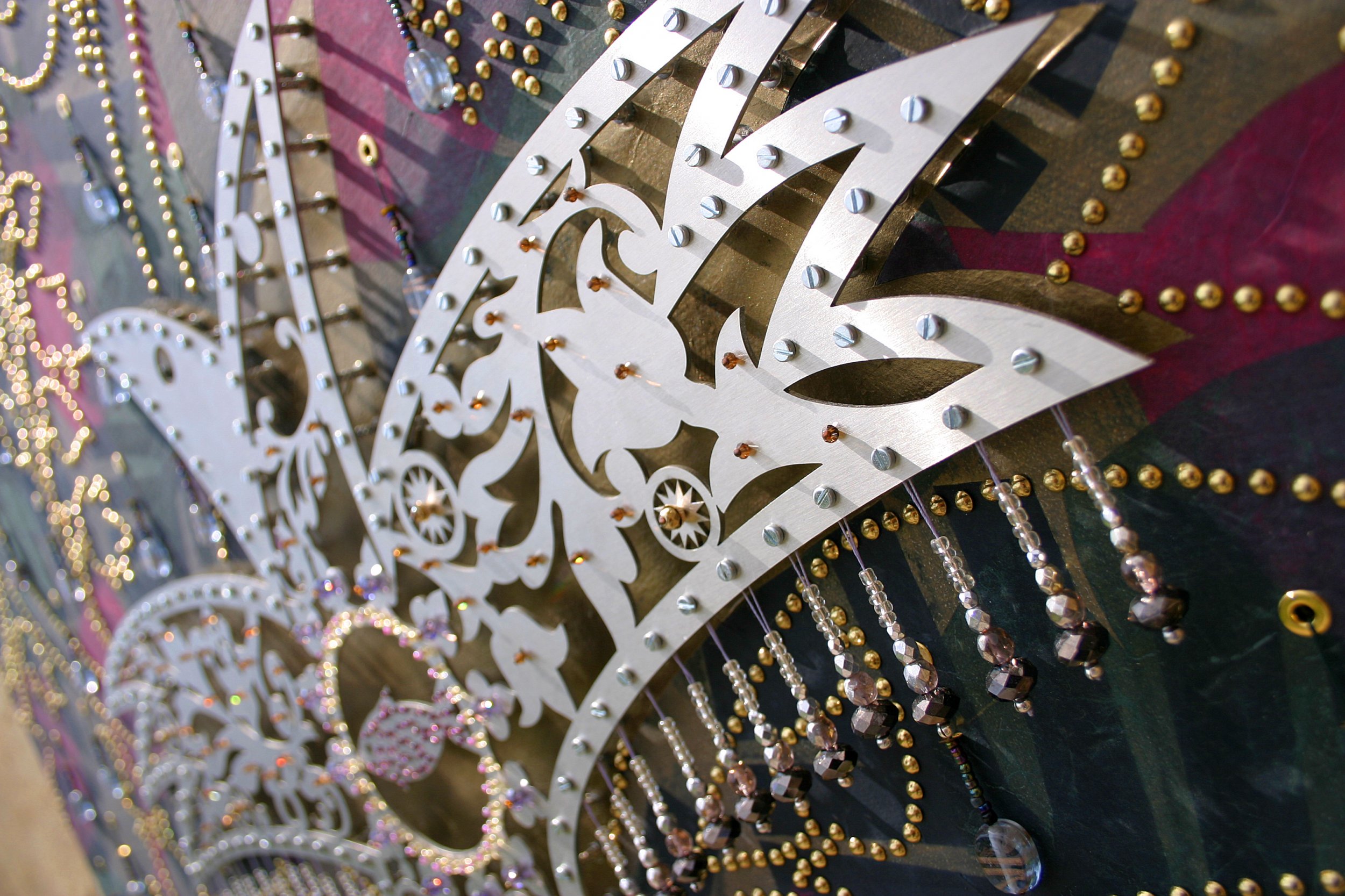 Cassonetto ligneo telato. Acrilico, collage carta, minuterie metalliche, borchie ottonate, filo, perle vetro e acciaio tagliato laser.