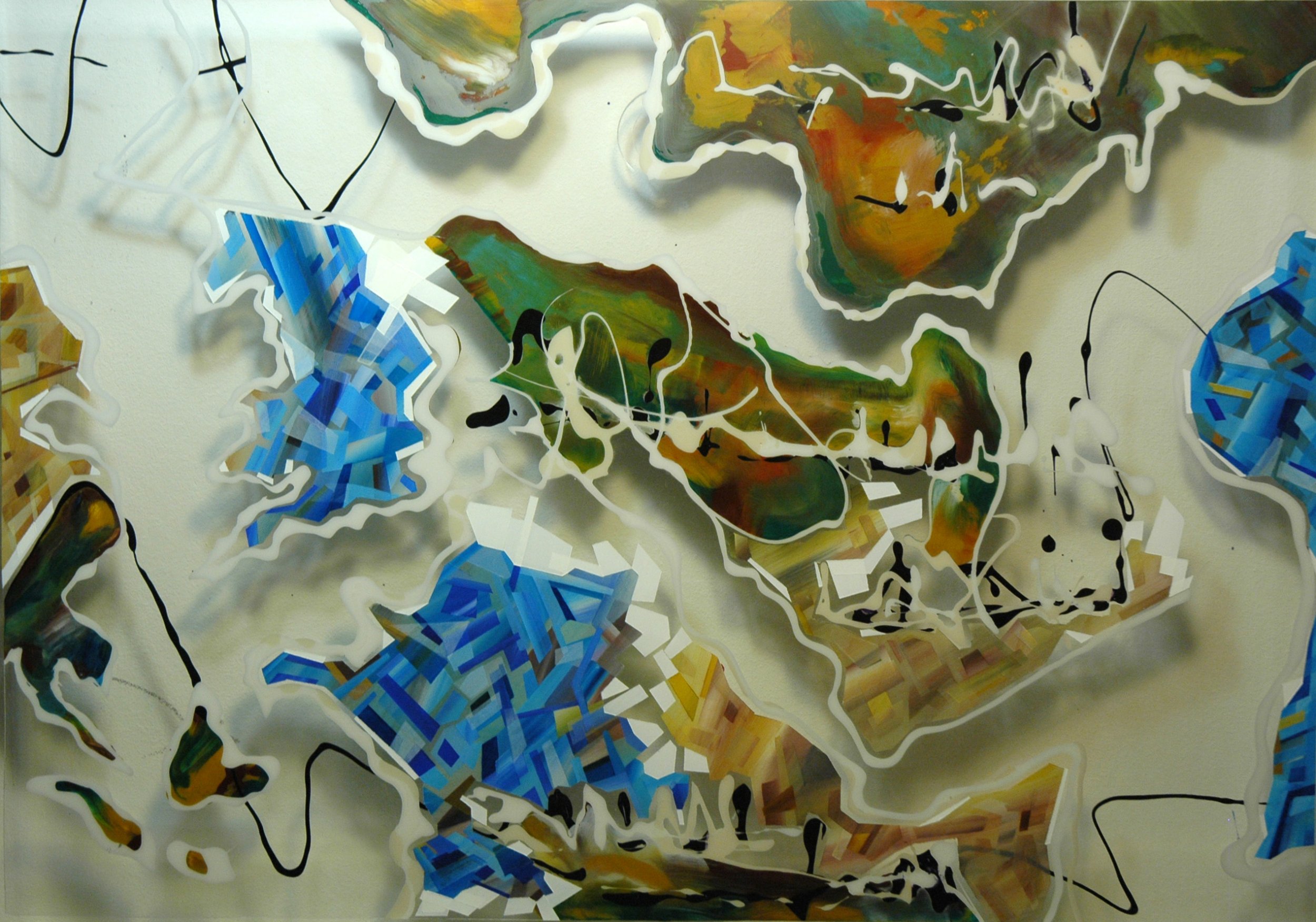 Fa parte di una serie di lavori ispirati al rapporto tra individuo e percezione di un mondo aperto, fluido,instabile nel quale quotidianamente cerchiamo di ricavarci un proprio spazio, determinando la nostra identità.In conseguenza dell'attuale trasformazione del nostro modo di vivere il mondo, immagino mappe geografiche che perdono la loro tradizionale riconoscibilità, si mescolano e scorrono porzioni di crosta terrestre, lasciando intuire nuovi percorsi e nuovi segni grafici ancora non convenzionali.