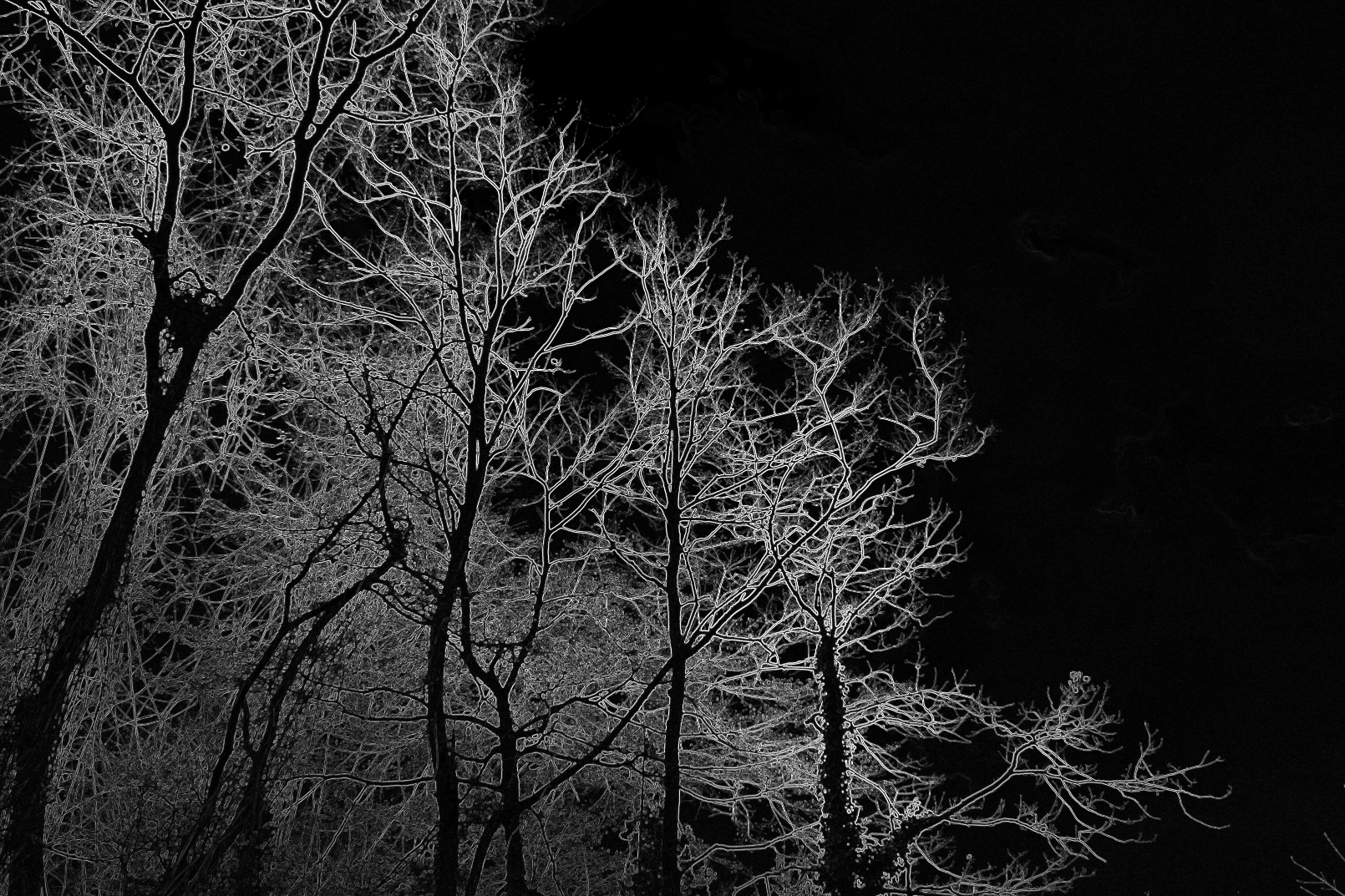 “Assenza “ è la scoperta del vuoto, la natura si scopre deprivata della sua stessa linfa, la luce non c’è più e quindi non c’è più clorofilla, non c’è più fotosintesi… resta solo la sensazione di un paesaggio spettrale bloccato in un atmosfera senza tempo. L’essenza stessa della vita è scomparsa o forse è rimasta imprigionata tra il buio della notte.