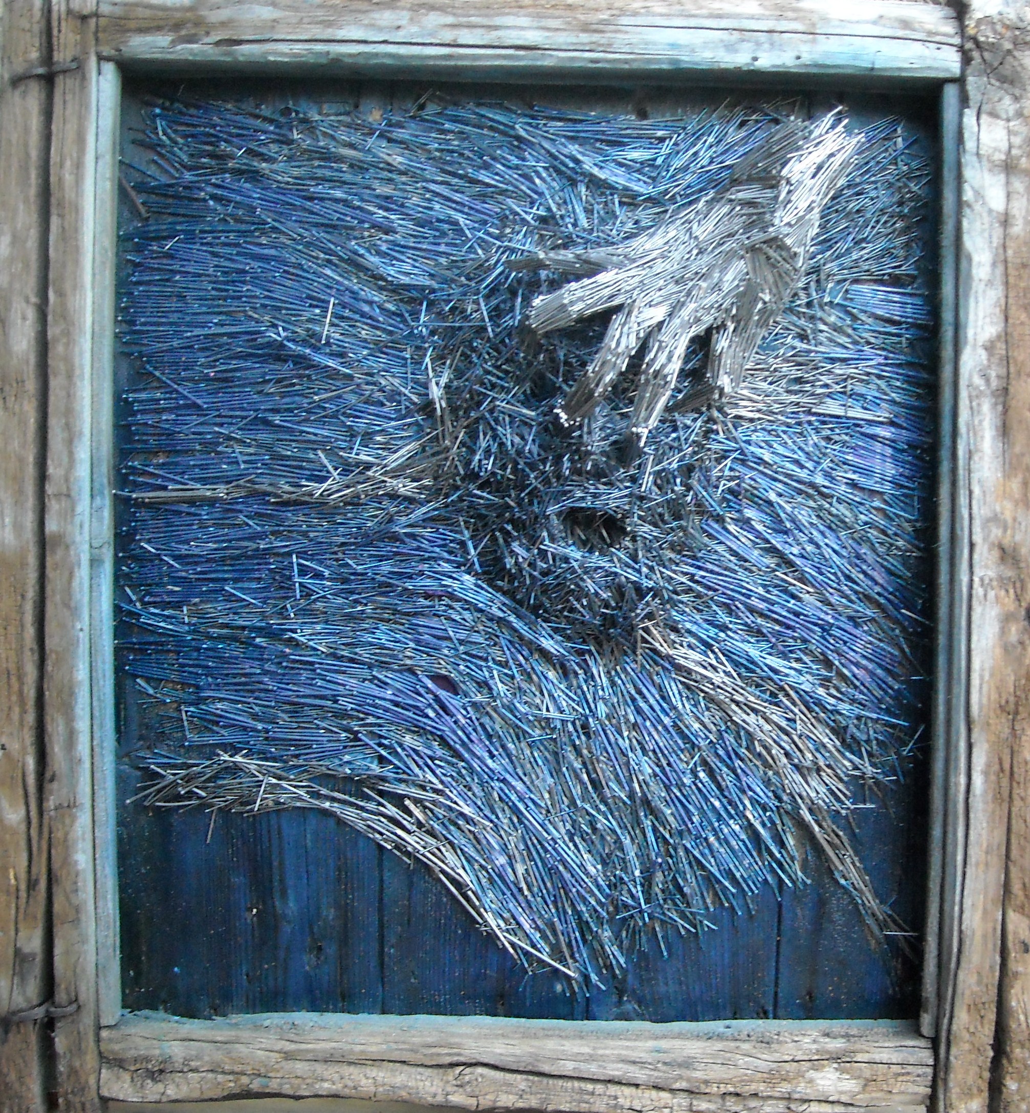 Opera realizzata con chiodi e resina su supporto ligneo, raffigurante un viso maschile affiorante dall'acqua. Una mano che credeva amica lo spinge ad affogare.