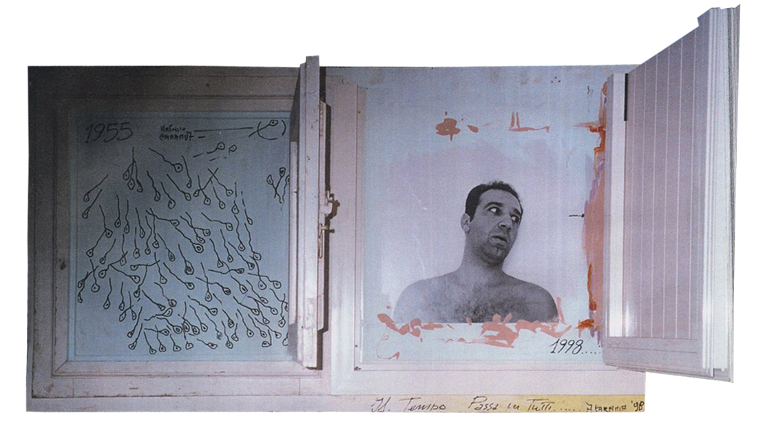 L'OPERA ANALIZZA LA PRESENZA DELL'UOMO NEL COSMO. VEDI L'INDIVIDUO COME SOGGETTO CHE ATTRAVERSA L'UNIVERSO... EGLI NASCE E VIVE COME LE COSE CHE HA COSTRUITO (LE DUE FINESTRE ANNI 50 E 90) E CHE LO AIUTANO AD ATTRAVERSARE LA VITA E A RICONDURLO ALLA MORTE (A DX DELL'OSSERVATORE). CHI SIAMO? COSA ESISTEVA PRIMA DELL'UOMO? COSA CI SARA' DOPO L'UOMO. A QUESTE DOMANDE DI AVVERTE UNO SMARRIMENTO PROFONDO E PIU' SI PENSA A QUESTO... PIù SI AVVERTE LA PERCEZIONE DI ESSERE UNA NULLITA' NEI CONFRONTI DELL'UNIVERSO COSMICO E INTERIORE.