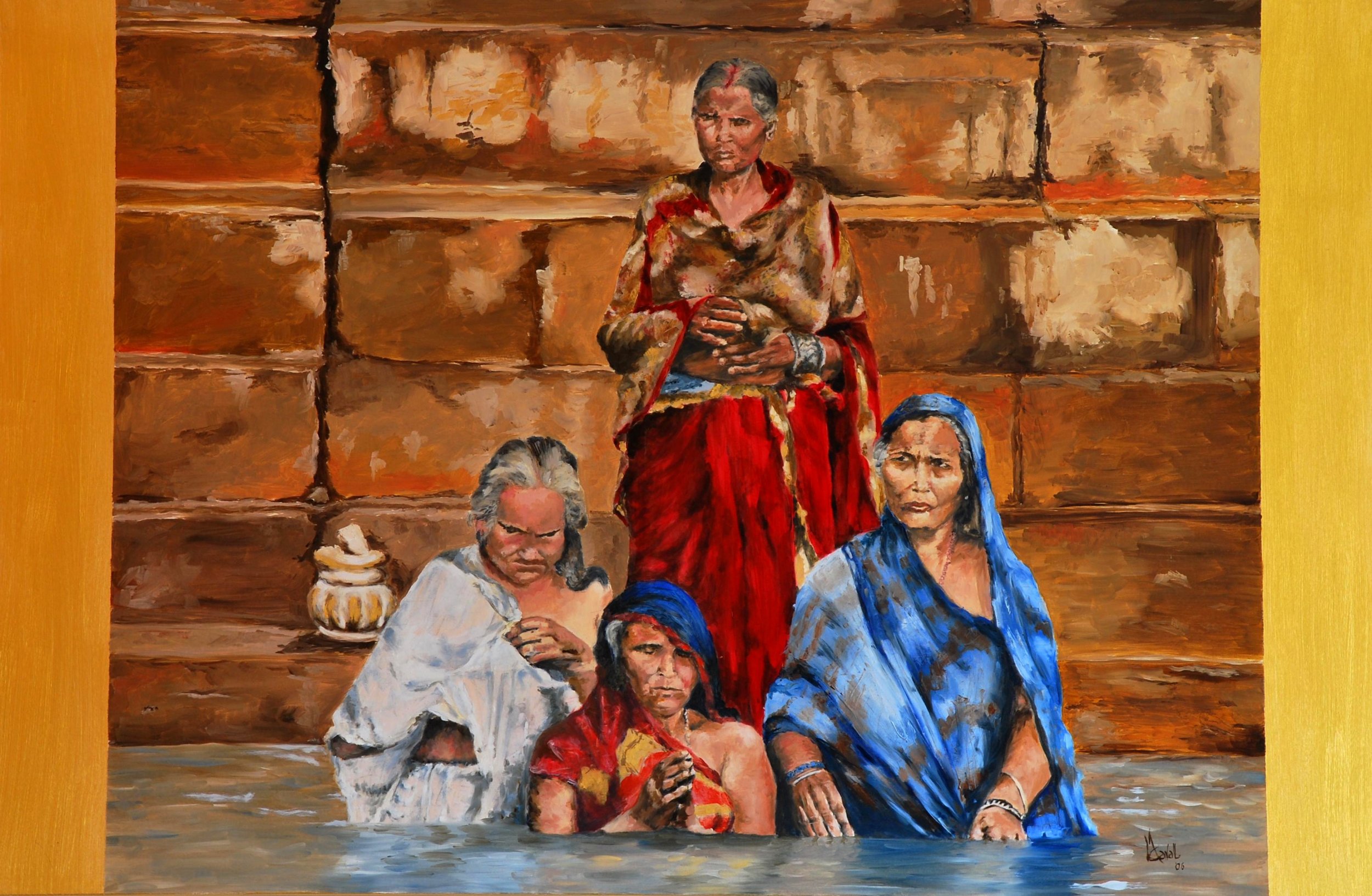 La sacralità del momento più intimo e pubblico delle donne nella pratica indiana delle immersioni nel Gange. Un'immagine che richiama alla costruzione classico-pittorica e che traspone verso la realtà che è passione nella credenza religiosa.