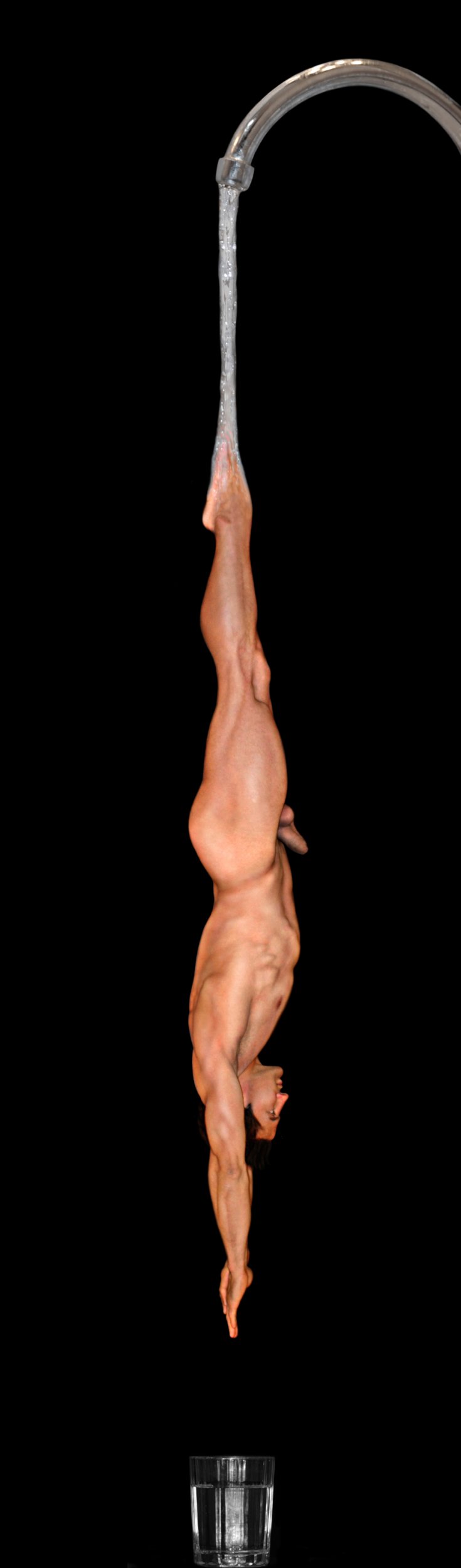 OPERA SULLA SOSPENSIONE E SULLA PERPENDICOLARITà SIA DEL CORPO UMANO NEL TUFFO SIA DELL'ACQUA IN CADUTA DA UN RUBINETTO ED ENTRAMBI CADONO ALL'INTERNO DI UN BICCHIERE MEZZO PIENO D'ACQUA. L'OPERA COMPLETA, CHE è ANCHE INSTALLAZIONE, SAREBBE CORREDATA DA UN MEZZO TRAMPOLINO VERO E NERO COL BORDO DORATO DELLA LARGHEZZA DI 45 CM CHE SPORGE IN AVANTI SUL CUI BORDO FRONTALE è POSTO UN BICCHIERE VERO E MEZZO PIENO D'ACQUA DEL TUTTO SIMILE A QUELLO RAFFIGURATO NELL'IMMAGINE E CHE RICHIAMA IL GIOCO NARCISISTICO DELL'ACQUA CHE RIFLETTE L'IMMAGINE E DELL'ESIBIZIONE SPORTIVA.