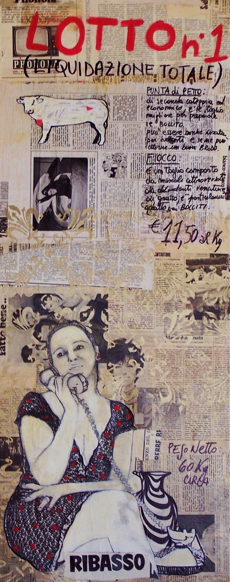 “Macelleria Bio-logica”, vuole essere l’espressione di questo, ora…… i miei corpi…. “indagati e ritratti in una sorta di sospensione, di nuova situazione”…… non sono più territorio di discorso, ma tornano ad essere carne, insieme di materiale biologico, che viene messo all’asta, in una disperata vendita al ribasso. In quest’ opera, nel primo lotto, è il mio corpo che metto in vendita. Vendita di carne dunque, vendita del proprio corpo, del mio e di altri… come merce di scambio, come possibilità di riscatto; niente di diverso da quello che stiamo vivendo, niente di diverso di quello che vediamo sui giornali!!!
