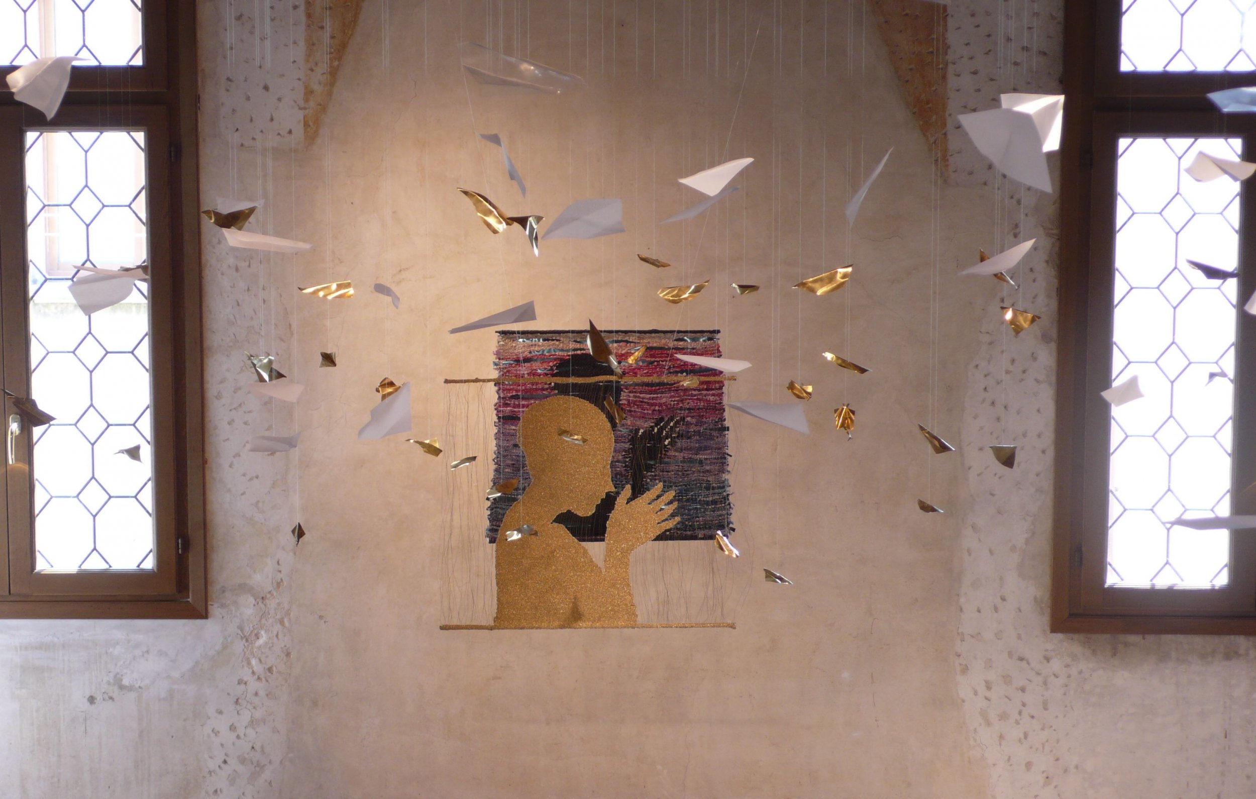 MATERIALI : part 1 ( fondo ) rafia, striscioline giornali, lamine acciaio ; part 2 fili ottone e fili dorati ; part 3 fili nylon, origami in ottone, carta pergamena , carta da lucido .