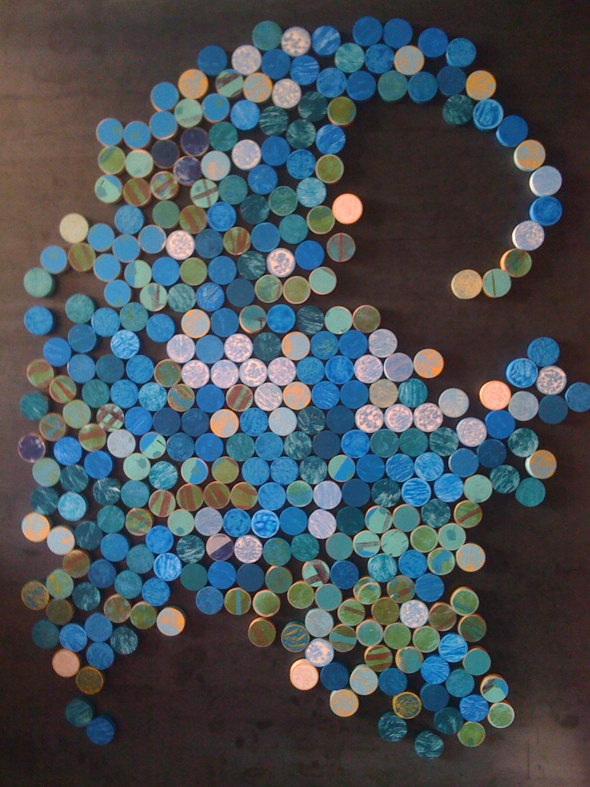 Each individual BIT is unique. They magnetically adhere to large steel canvases attached to the wall. By combining a large number of BITS together into a collection a work of art emerges that is not intended to be static. My work is indeed meant to be rearranged, therefore redefined. Constructed and deconstructed. This simple mounting system makes for infinitely variable compositions that take on a life force of their own as they migrate around the steel canvas manipulated by the hands of others. Life is not rigid, why should art be? I am completely taken with the idea of the potentially infinite and am creating an art form that is capable of it.