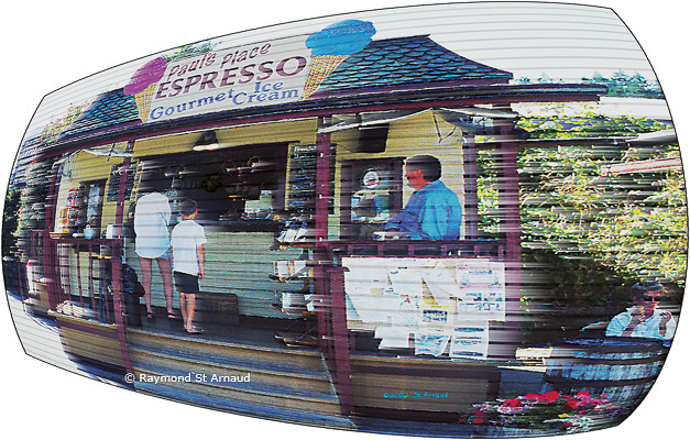 From the collection "A Seen on TV". A symbolic representation of a TV screen with cultural representation of TV scan lines. The site is a roadside confectionary - ice cream - coffee vendor.