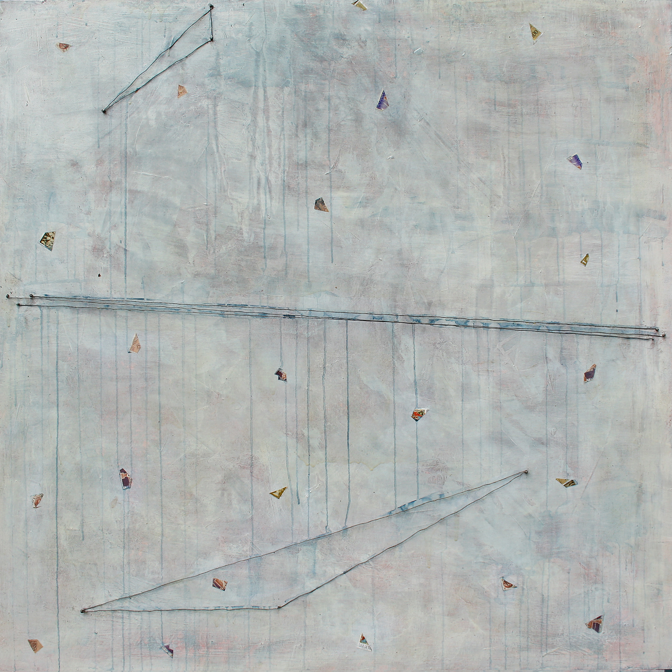 Il “post”, oltre che nella sua accezione latina di “dopo”, va inteso anche nella sua valenza anglosassone. Post significa infatti posta ed è giustificato dall’utilizzo di francobolli come elemento strutturante dell’opera. Francobolli asettici, senza identità, frantumanti, sminuzzati, sparsi in ordine casuale su una tavola sbiadita, lacrimante, significativa dell’a-temporalità e dell’a-spazialità del paesaggio. I colori tenui, diluiti, enfatizzano l’anemicità di tale luogo al di fuori della dimensione spazio temporale. Una luogo senza tempo, una terra di nessuno, che proprio per questo appartiene, di diritto, a tutti. Almeno a livelo immaginativo.