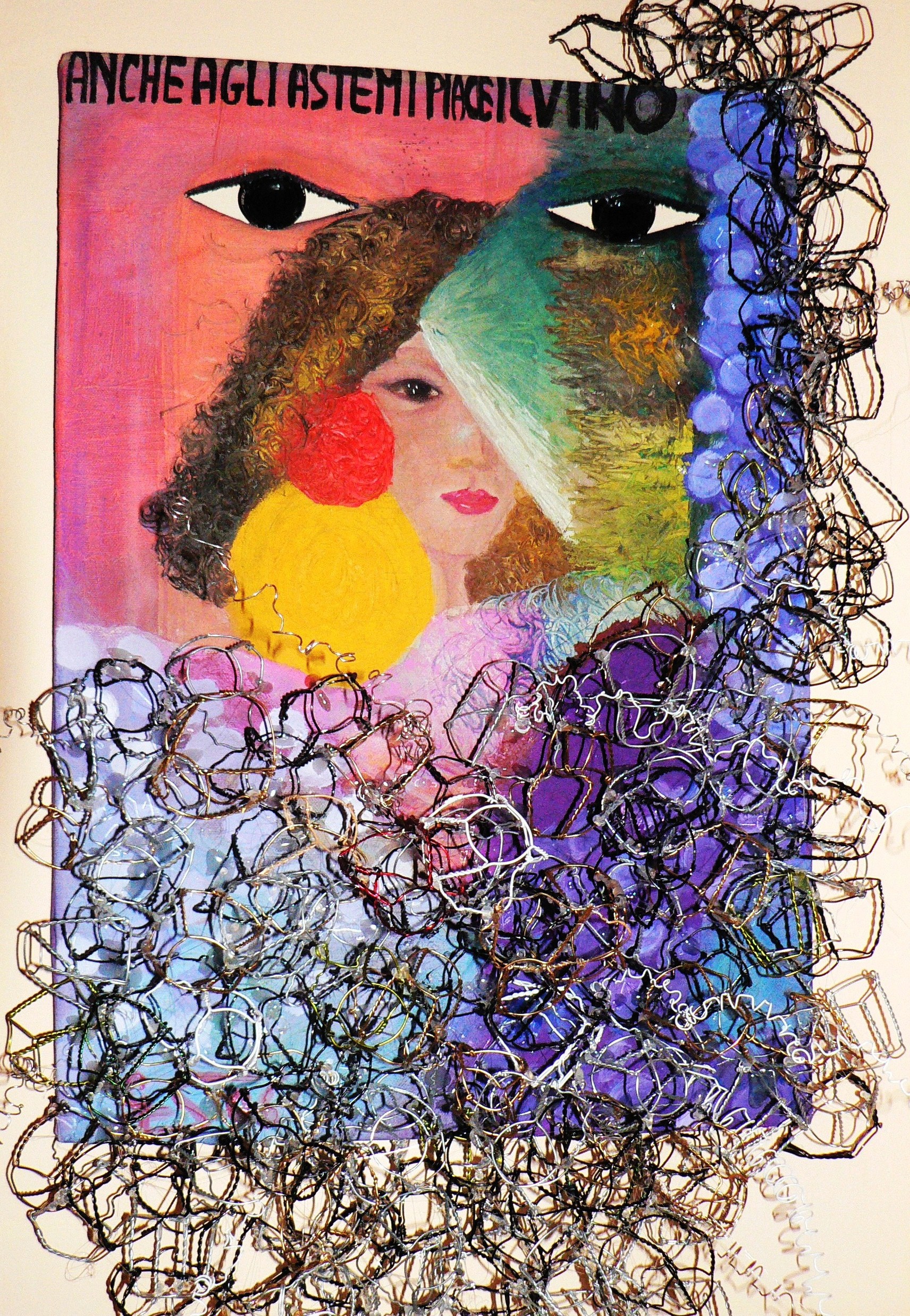intrecciate tra loro per formare un grappolo d'uva , gli occhi inseriti nella tela sono capsule metalliche del vino.