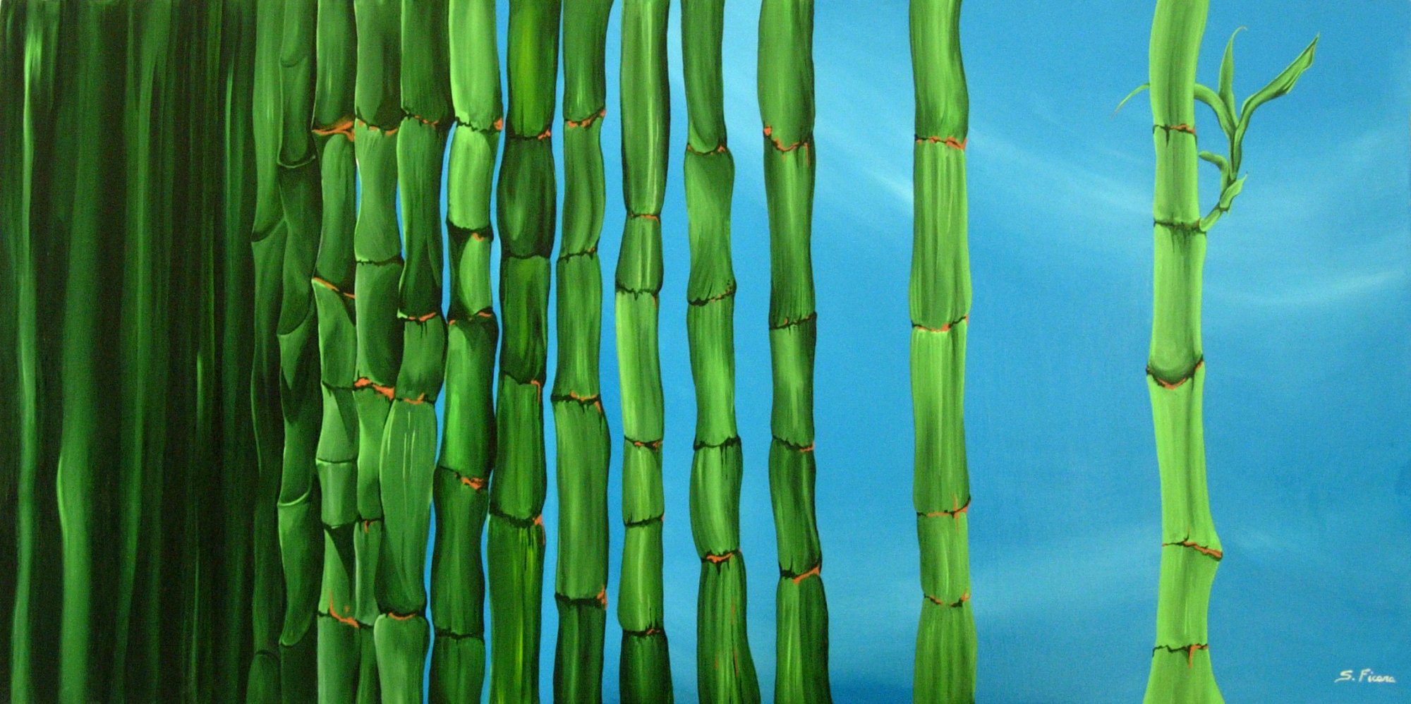 Il vento porta con sé pensieri, colori, passioni… il vento soffia sempre più forte e attraverso le canne di bambù, suona una musica magica… la musica della nostra vita. Anche in quest’opera il passato è rappresentato da sfumature che cambiano e diventano forme sempre più delineate, man mano che il presente si avvicina. Il vento soffia più forte e le note si fondono nel ritmo del nostro cuore. Le canne di bambù si schiariscono e si separano tra loro… il presente… il futuro che diventa, attraverso i nostri sogni e desideri, un germoglio di vita.