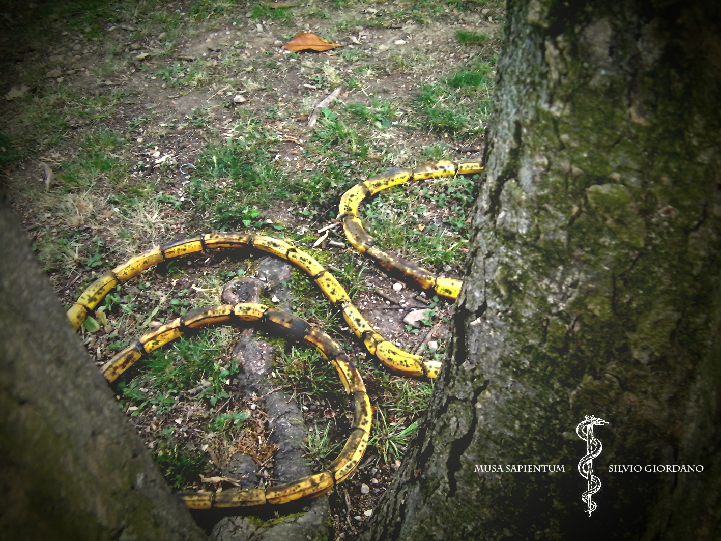 Il serpente è uno dei più vecchi e più diffusi simboli mitologici, essendo presente nella maggior parte delle culture con significati simili. Ad esempio il suo veleno è associato, come le piante e i funghi, al potere di guarire, avvelenare, o donare una coscienza espansa. Il suo cambiare pelle lo rende inoltre un simbolo di rinnovamento e rinascita che può portare all'immortalità. La pelle di banana nel corso della mostra sarà soggetta al deperimento cambiando colore dal verde al nero.