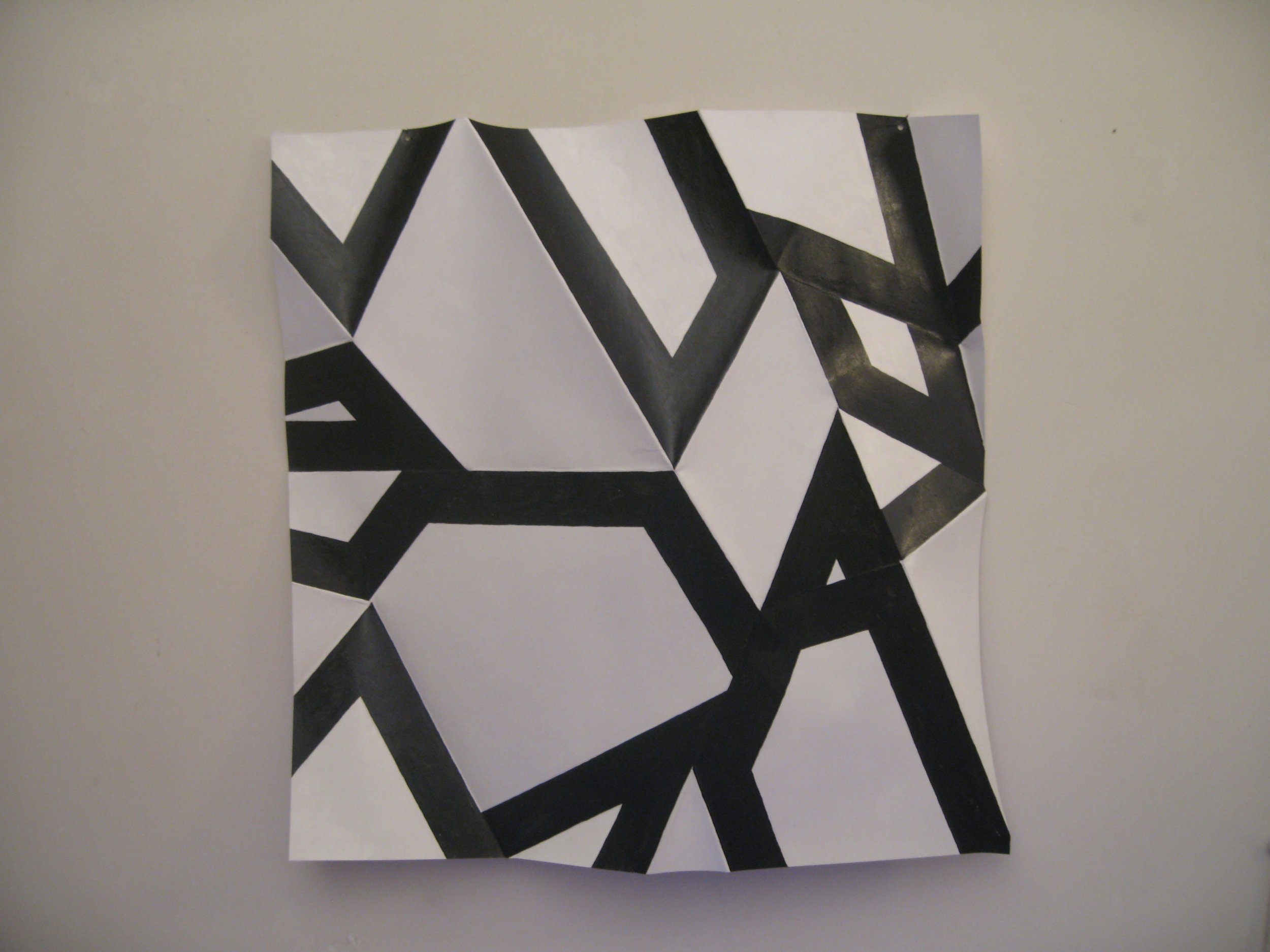 L'attenzione della mia ricerca è rivolta più al processo o all'azione, che alla forma. Quest'ultima è solo conseguenza del gesto di piegare il supporto cartaceo per ridurne le dimensioni. Invece l'aspetto pittorico, relativo al principio di restituire alla forma il disegno che l'ha creata, è espressione dell'azione di riempimento della superfice, attraverso imperfette campiture di colore bianco e nero di smalto acrilico industriale.