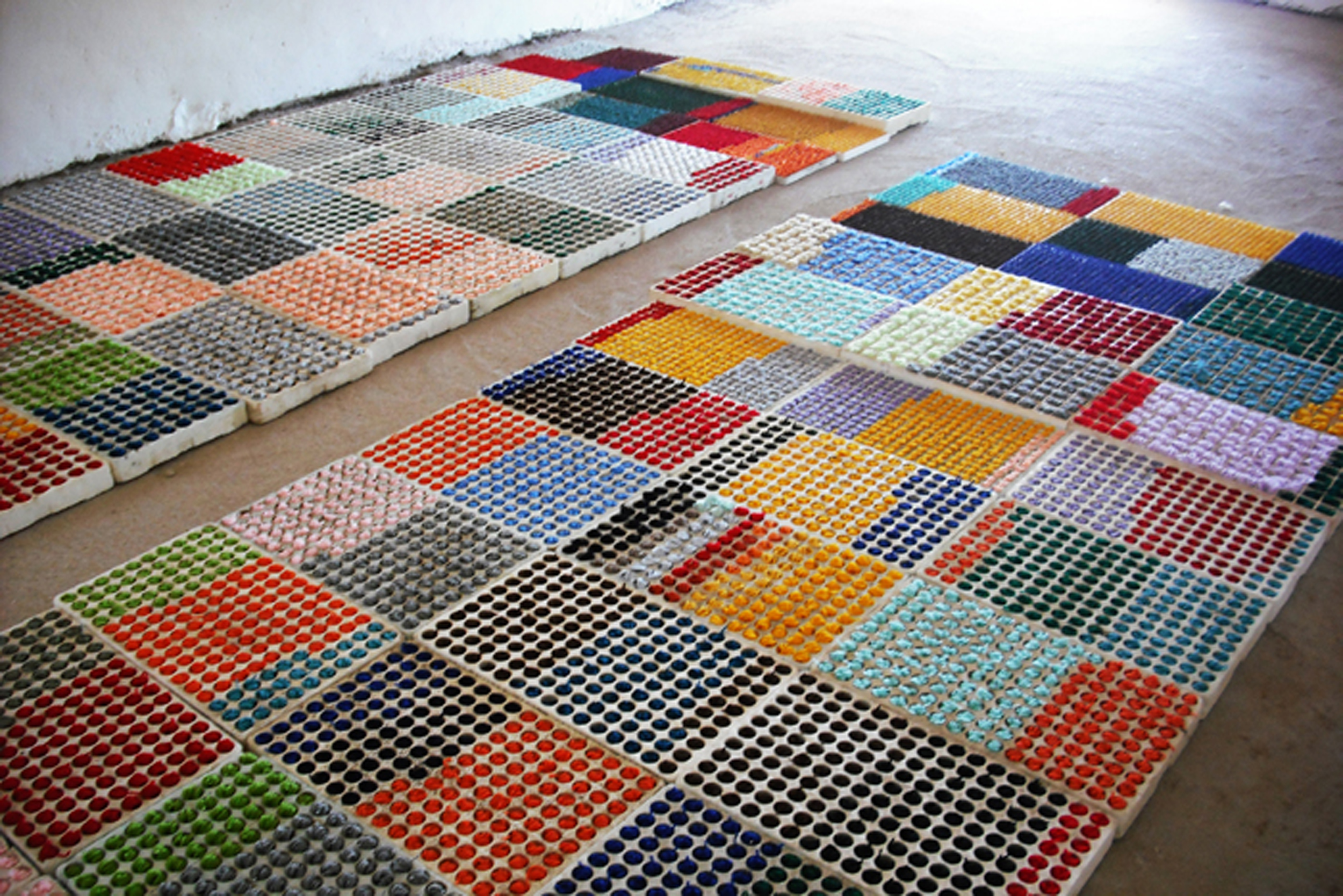 Decine di seminiere in polistirolo, in cui la terra e i semi sono stati sostituiti da micro gomitoli di fibra e colore diversi. Come all'interno di una serra invisibile, la disposizione delle seminiere ricorda quella tipica usata dagli agricoltori, con una passerella al centro, una linea, appunto, che vediamo ripetuta su tutta la sperficie dell'opera.