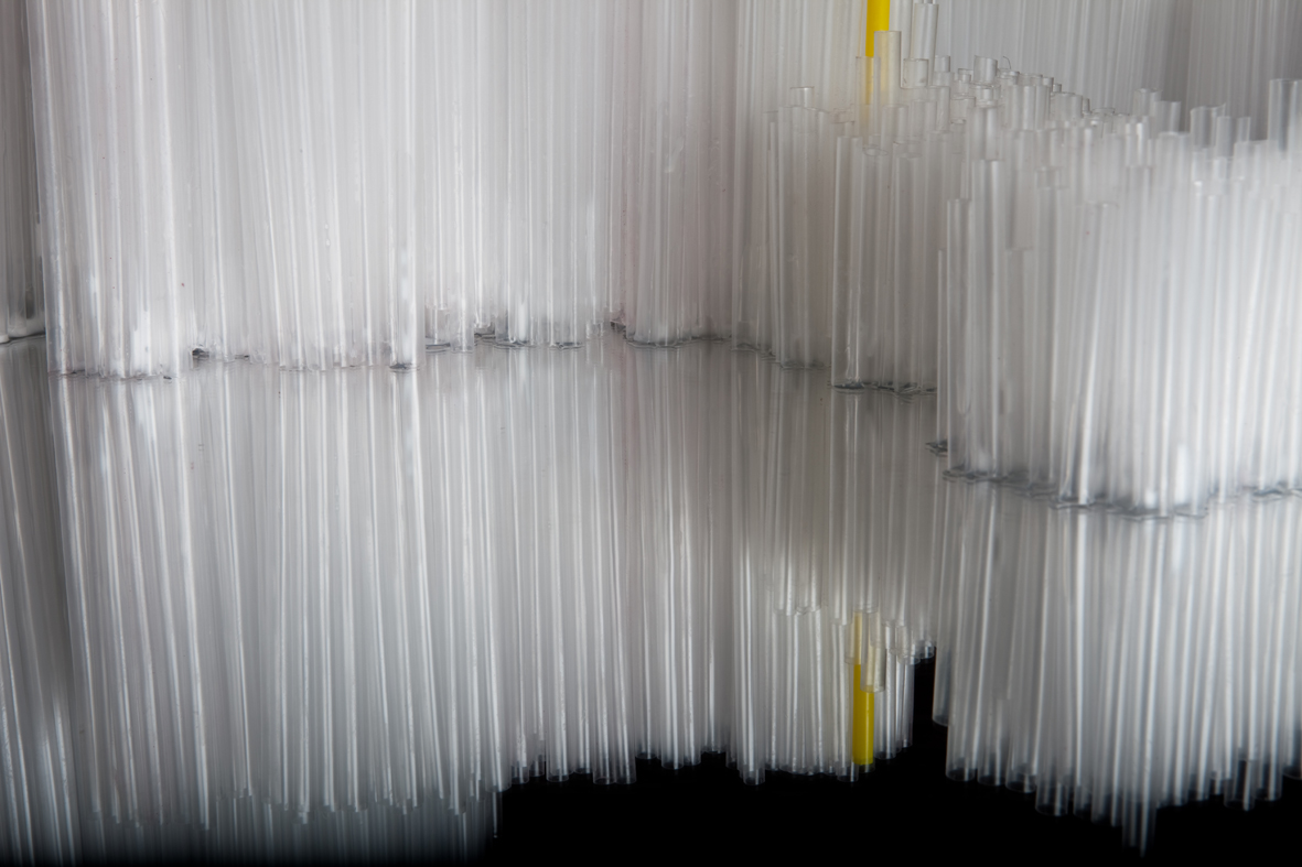 Un oggetto d'uso è riproposto in ICEBERG: lo sfondo di plexiglass specchiante ospita sulla sua superficie piana numerose cannucce di plastica trasparente che assemblate, creano informi "isole galleggianti".