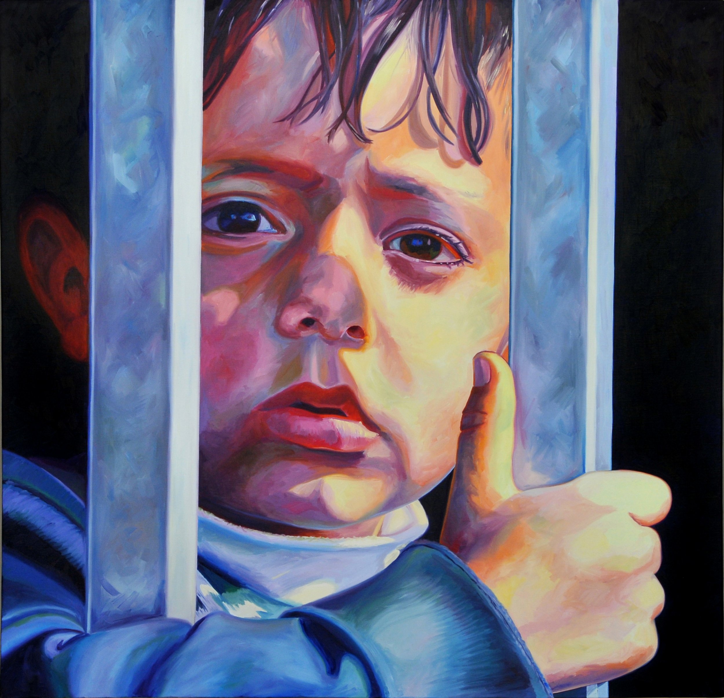 Un bimbo dietro la ringhiera di casa? No! È un palestinese dietro l’inferriata di metallo di un Check point, tra Betlemme e Gerusalemme, tra Palestina e Israele. Non aspetta altro che giocare, aspetta la luce... aspetta di potere vivere la terra come luogo in cui giocare