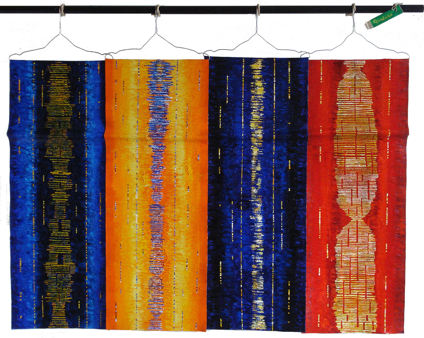 Quattro strisce di tela dipinte ad olio, con andamento ondulato e agganciate a stampelline in fil di ferro, sono sospese ad un bastone. L’autore ha scelto questa composizione che è tra le possibili combinazioni che le quattro strisce di tela possono formare.
